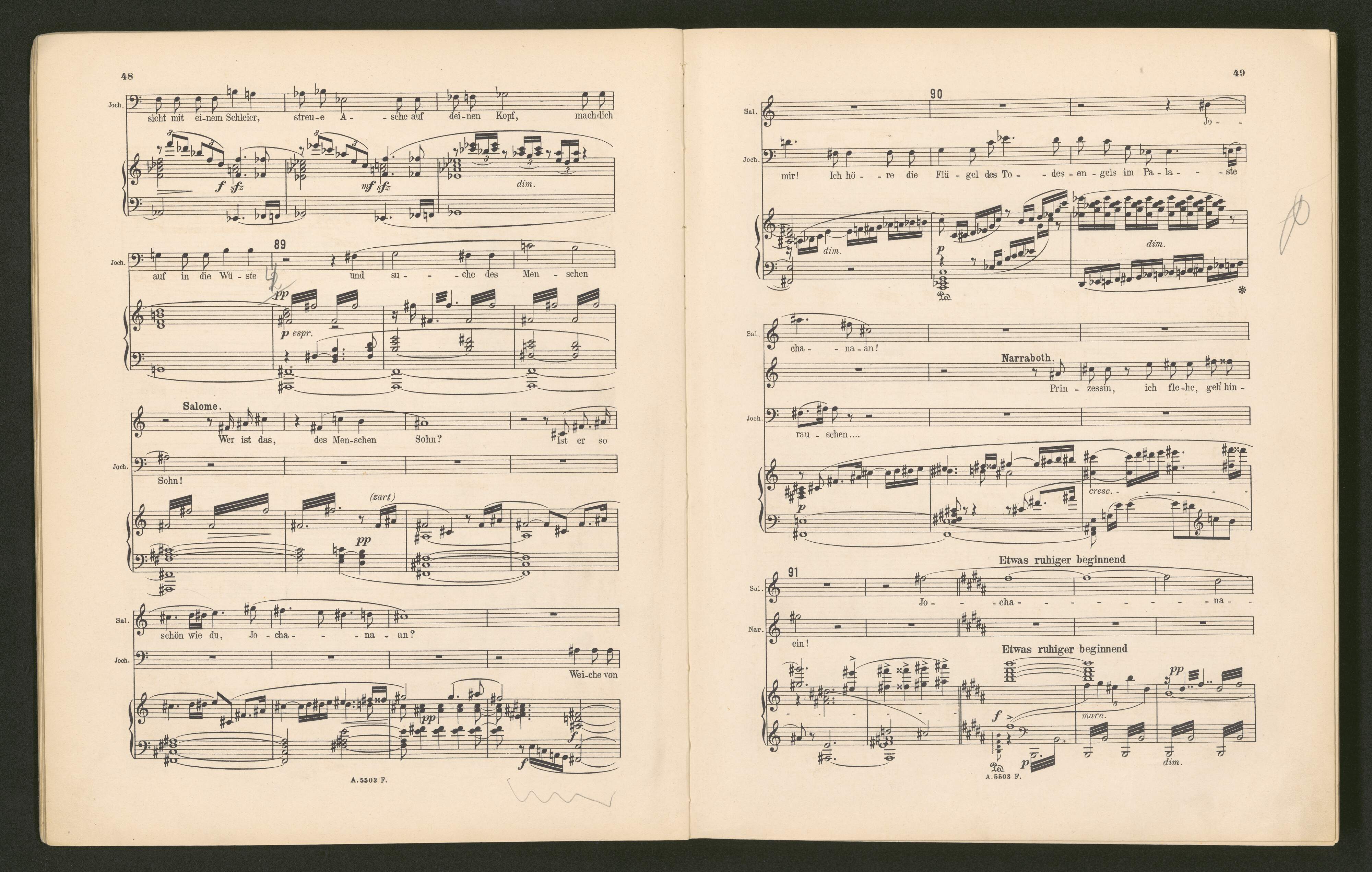 [title page:] Das Recht der Aufführung ist vorbehalten. | DR. RICHARD STRAUSS. | Meinem Freunde EDGAR SPEYER. | SALOME. | Drama in einem Aufzuge | nach OSCAR WILDE'S gleichnamiger Dichtung | in deutscher Übersetzung von Hedwig Lachmann. | Musik | von | RICHARD STRAUSS. | Op. 54. | Klavier-Auszug mit Text | von | OTTO SINGER. | Preis M. 16. - netto. | Eigentum des Verlegers für alle Länder. | BERLIN W. | ADOLPH FÜRSTHNER. | Alle Rechte vorbehalten. | Copyright including Right of Performance 1905 by Adolph Fürstner. | A. 5503 F. | C. G. Röder G. m. b. H., Leipzig. 3015. 05