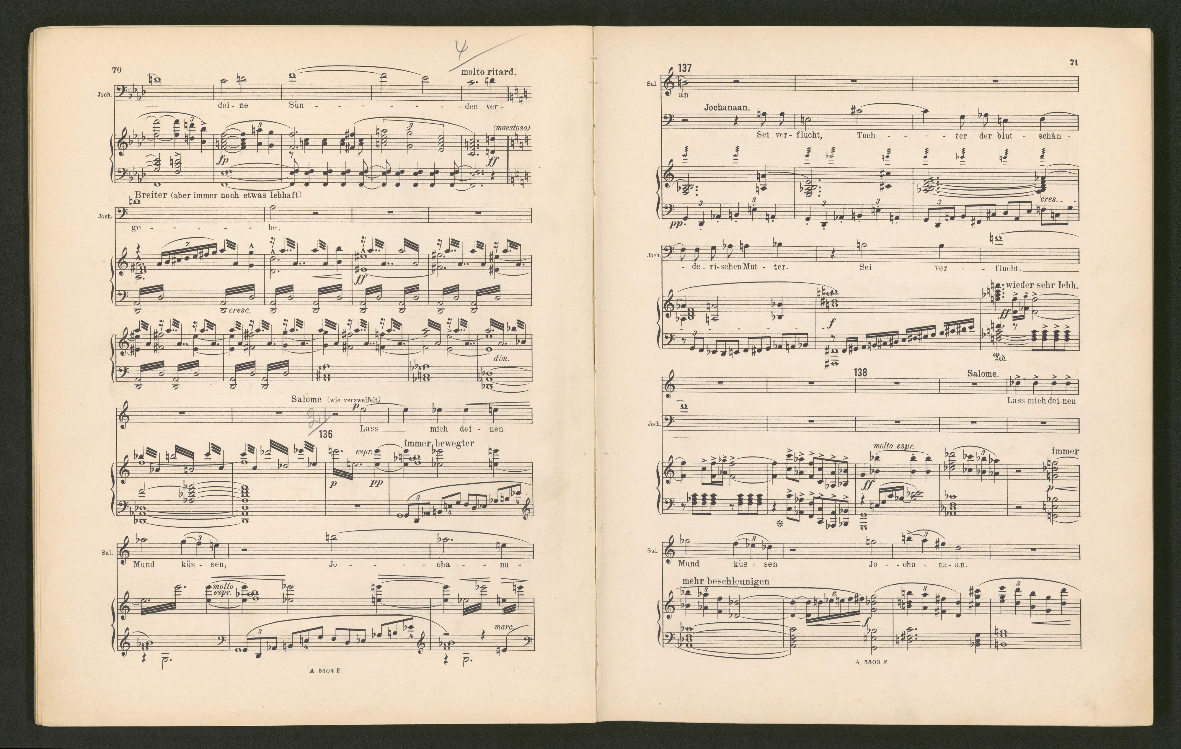 [title page:] Das Recht der Aufführung ist vorbehalten. | DR. RICHARD STRAUSS. | Meinem Freunde EDGAR SPEYER. | SALOME. | Drama in einem Aufzuge | nach OSCAR WILDE'S gleichnamiger Dichtung | in deutscher Übersetzung von Hedwig Lachmann. | Musik | von | RICHARD STRAUSS. | Op. 54. | Klavier-Auszug mit Text | von | OTTO SINGER. | Preis M. 16. - netto. | Eigentum des Verlegers für alle Länder. | BERLIN W. | ADOLPH FÜRSTHNER. | Alle Rechte vorbehalten. | Copyright including Right of Performance 1905 by Adolph Fürstner. | A. 5503 F. | C. G. Röder G. m. b. H., Leipzig. 3015. 05