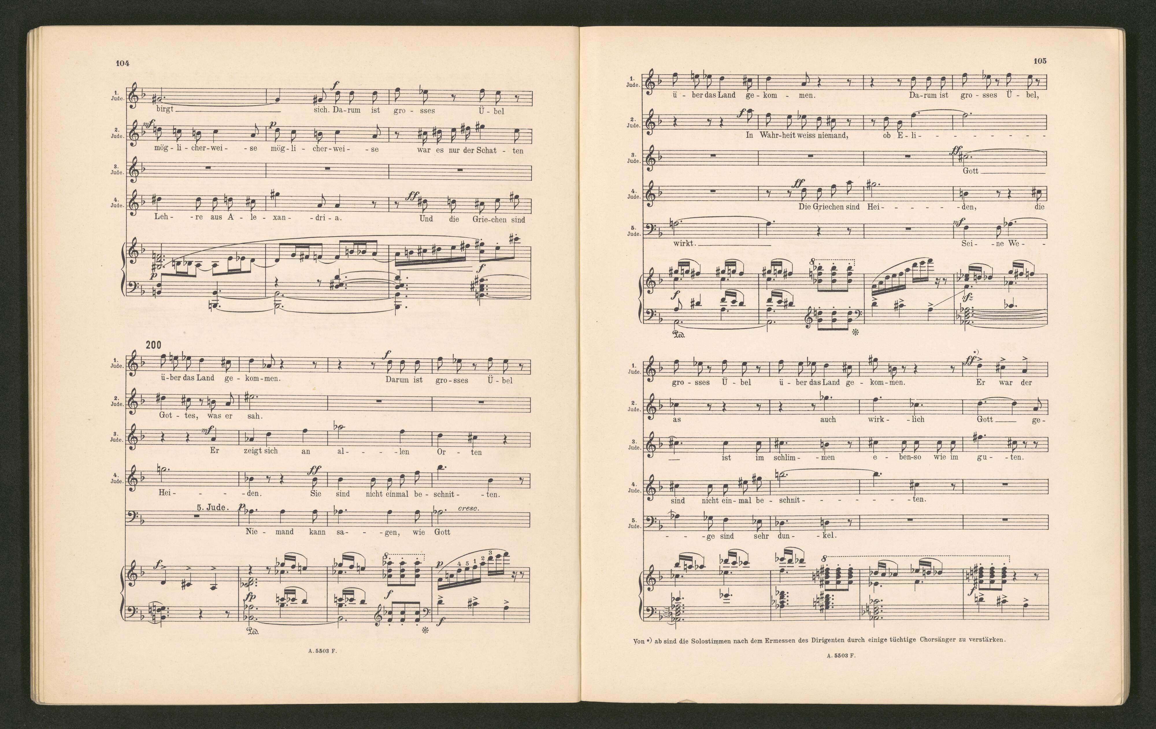 [title page:] Das Recht der Aufführung ist vorbehalten. | DR. RICHARD STRAUSS. | Meinem Freunde EDGAR SPEYER. | SALOME. | Drama in einem Aufzuge | nach OSCAR WILDE'S gleichnamiger Dichtung | in deutscher Übersetzung von Hedwig Lachmann. | Musik | von | RICHARD STRAUSS. | Op. 54. | Klavier-Auszug mit Text | von | OTTO SINGER. | Preis M. 16. - netto. | Eigentum des Verlegers für alle Länder. | BERLIN W. | ADOLPH FÜRSTHNER. | Alle Rechte vorbehalten. | Copyright including Right of Performance 1905 by Adolph Fürstner. | A. 5503 F. | C. G. Röder G. m. b. H., Leipzig. 3015. 05