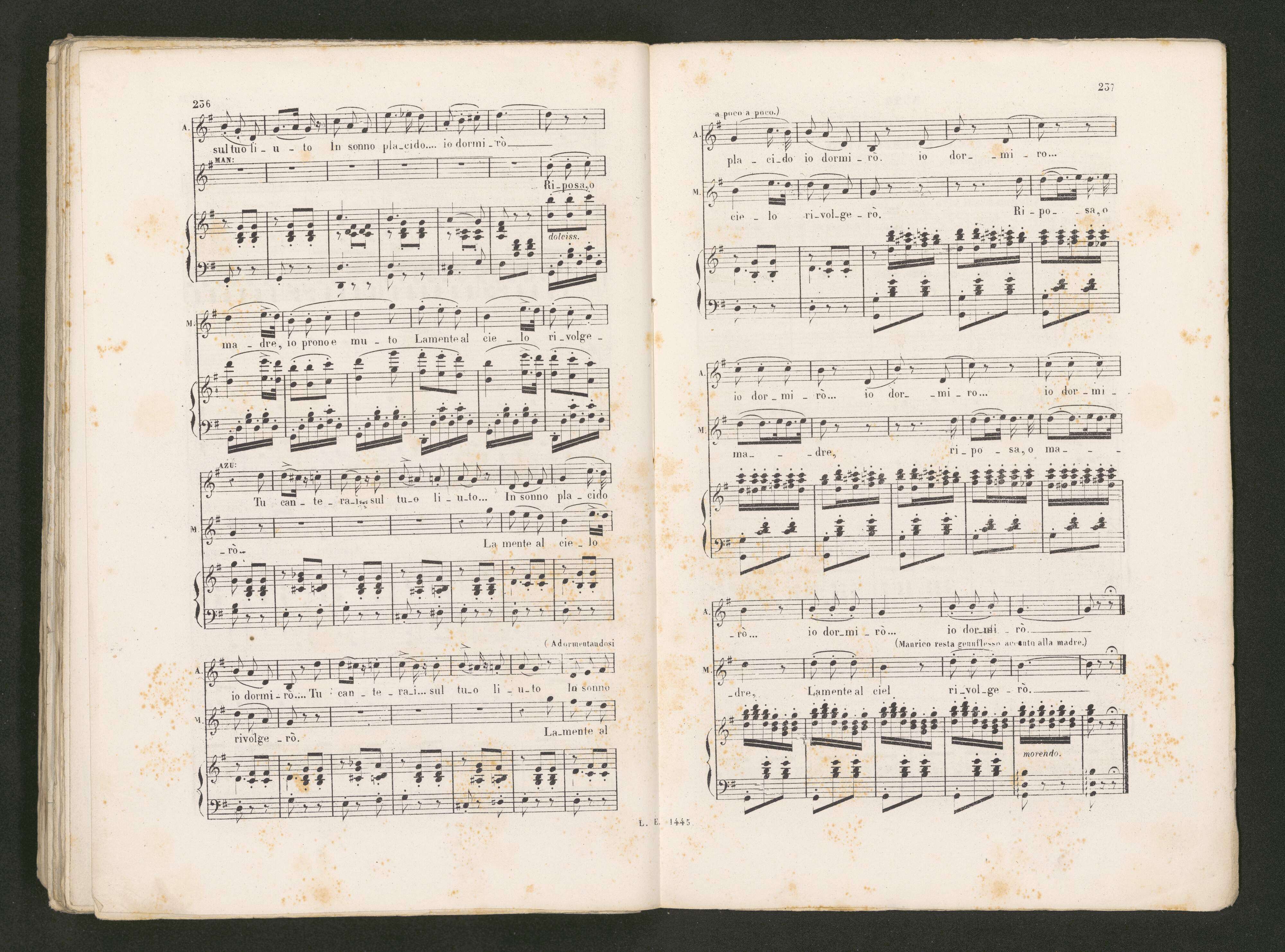 [title page:] G. Verdi | IL | Trovatore | OPERA IN QUATTRO ATTI | Prezzo netto: 12 franchi. | QUATORZIÈME ÉDITION | PARIS | LÉON ESCUDIER, ÉDITEUR DE MUSIQUE | 21, RUE DE CHOISEUL