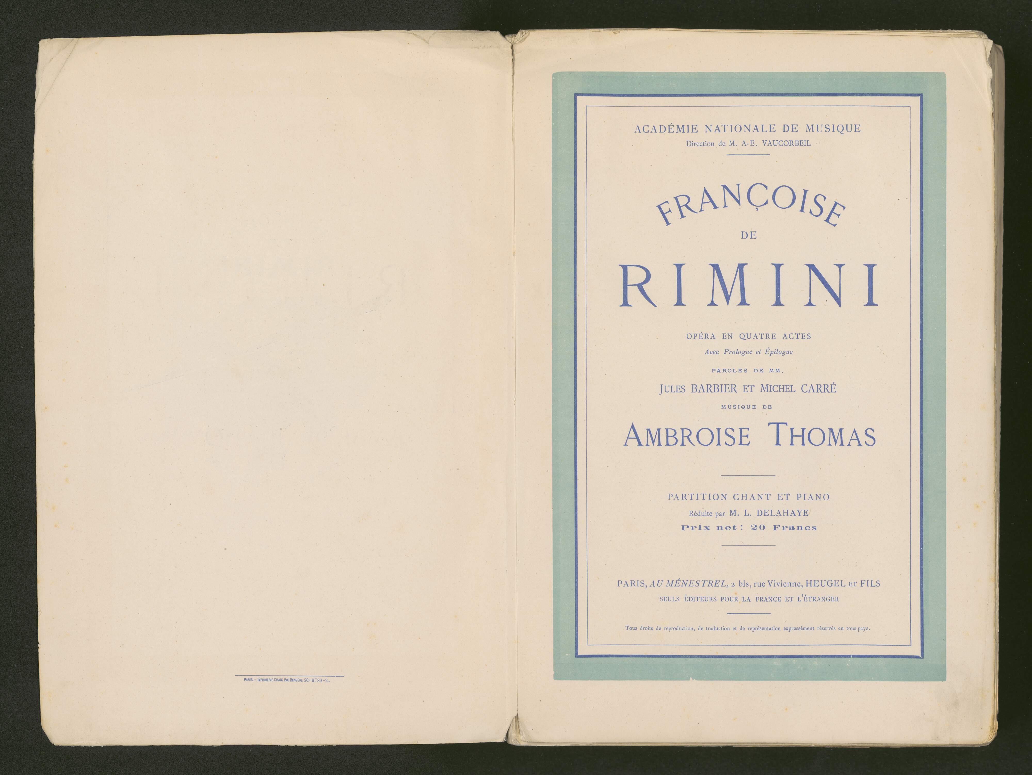 [title page:] 2|me EDITION | ACADÉMIE NATIONALE DE MUSIQUE | FRANÇOISE | DE | RIMINI | OPERA EN QUATRE ACTES | PAROLES, DE MM. | JULES BARBIER ET MICHEL CARRÉ | MUSIQUE DE | AMBROISE THOMAS | Partition Chant et Piano | Net: 20 Francs. | PARIS, AU MÉNESTREL, 2 bis, rue Vivienne, HEUGEL ET FILS | SEULS ÉDITEURS POUR LA FRANCE ET L'ÉTRANGER | Tous droits de reproduction, de traduction et de publication expressement réservés en tous pays