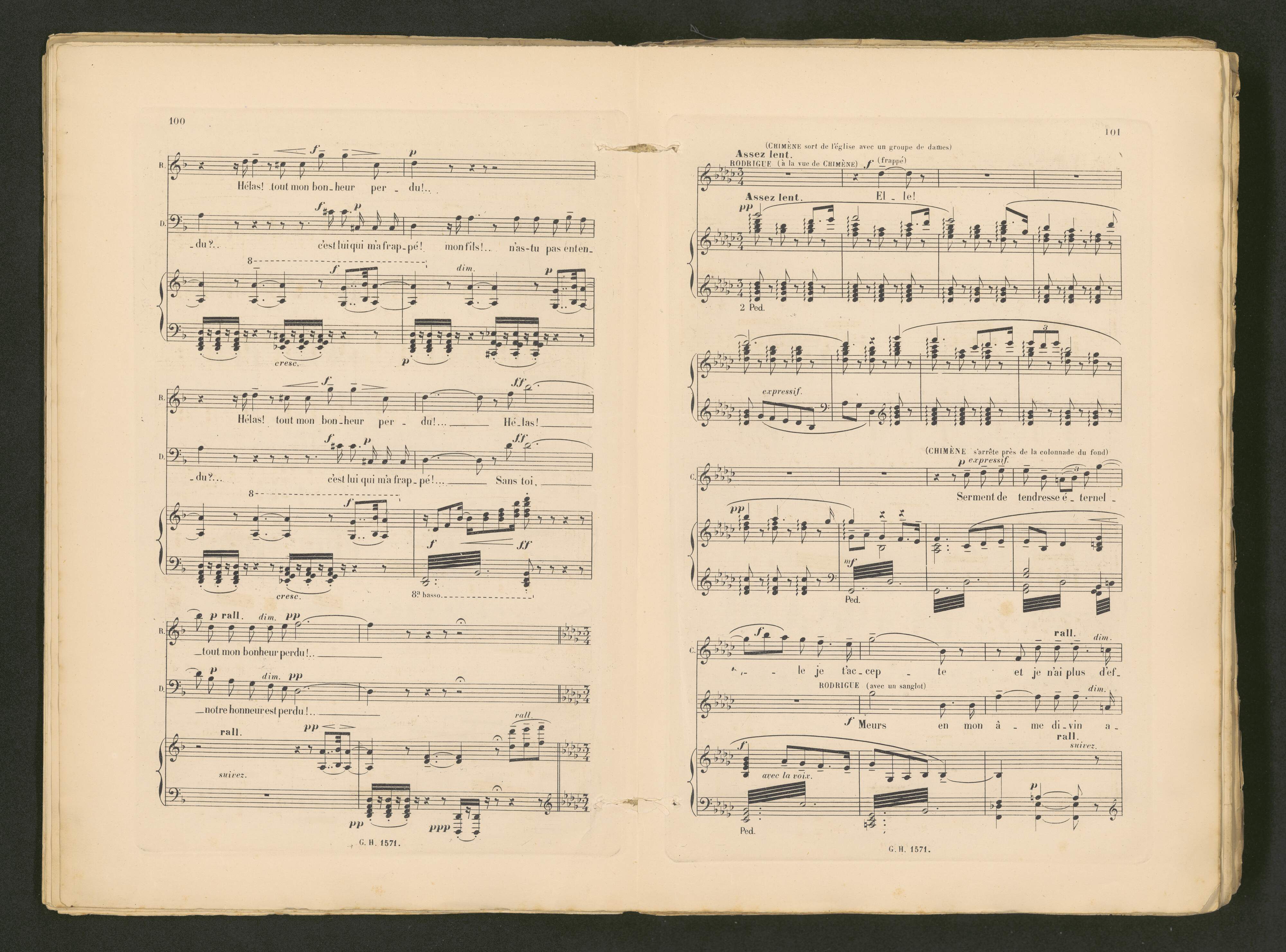 ACADÉMIE NATIONALE DE MUSIQUE | LE CID | OPÉRA | en quatre Actes & dix Tableaux | de M.M. | Ad.D'ENNERY, L.GALLET, ed Ed.BLAU | musique de | J. MASSENET | Partition Chant & Piano | Prix net: 20 |f. | PARIS HEUGEL & C.|i|e EDITEURS, | 2.|b|i|s Rue Vivienne | Droits de traduction de representation et de repreduction | réservés et enregistrés pour tous pays