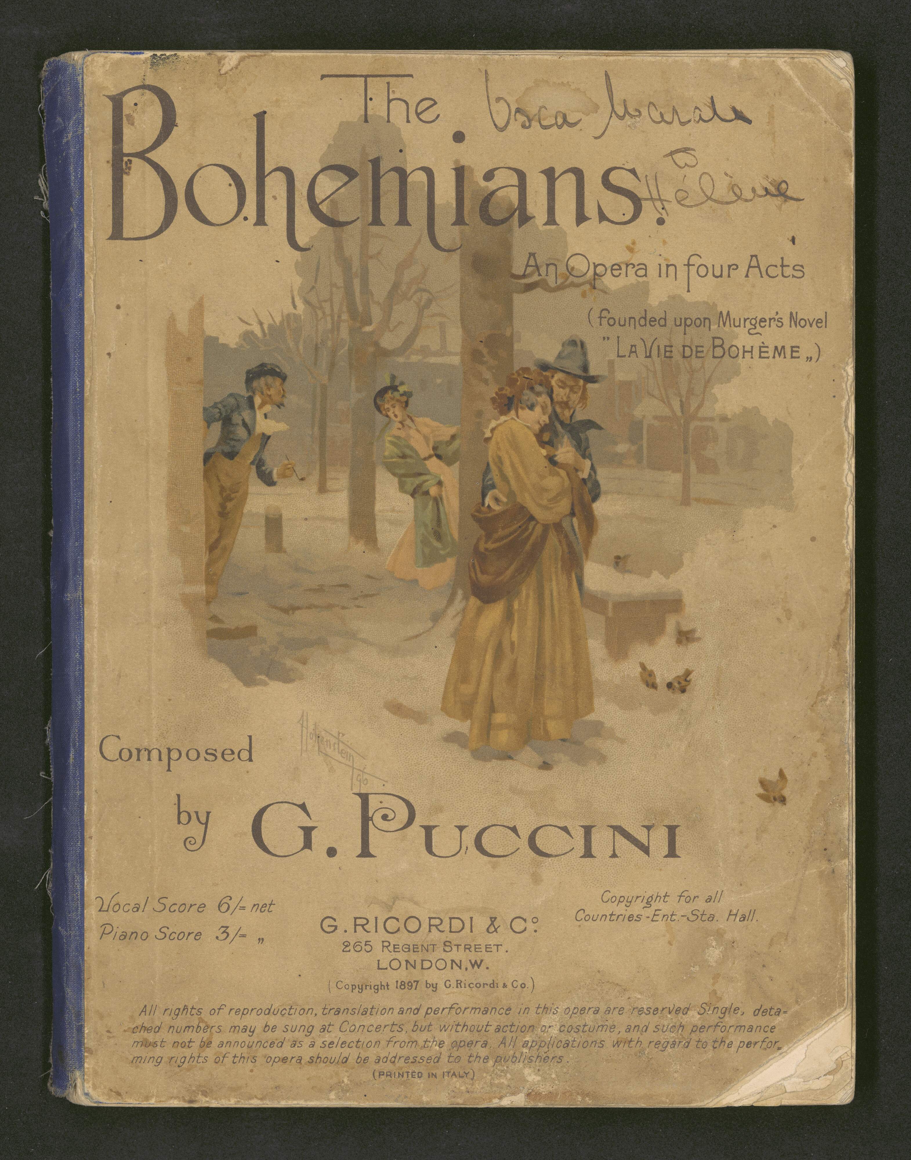 THE BOHEMIANS | (FOUNDED UPON "LA VIE DE BOHÈME" BY HENRY MURGER) | AN OPERA IN FOUR ACTS | BY | GIUSEPPE GIACOSA AND LUIGI ILLICA | MUSIC BY | GIACOMO PUCCINI | ENGLISH VERSION OF | ACTS I AND II WILLIAM GRIST | ACTS III AND IV BY PERCU PINKERTON | PIANO SCORE 3/-NET (A) | ARRANGED BY CARLO CARIGNANI | G. RICORDI & CO. | MUSIC PUBLISHERS MILIAN - ROME - NAPLES - PALERMO - PARIS | AND | LONDON W. \ 265 REGENT STREET. | (Copyright 1897 by G. Ricordi & Co.) | (PRINTED IN ITALY)