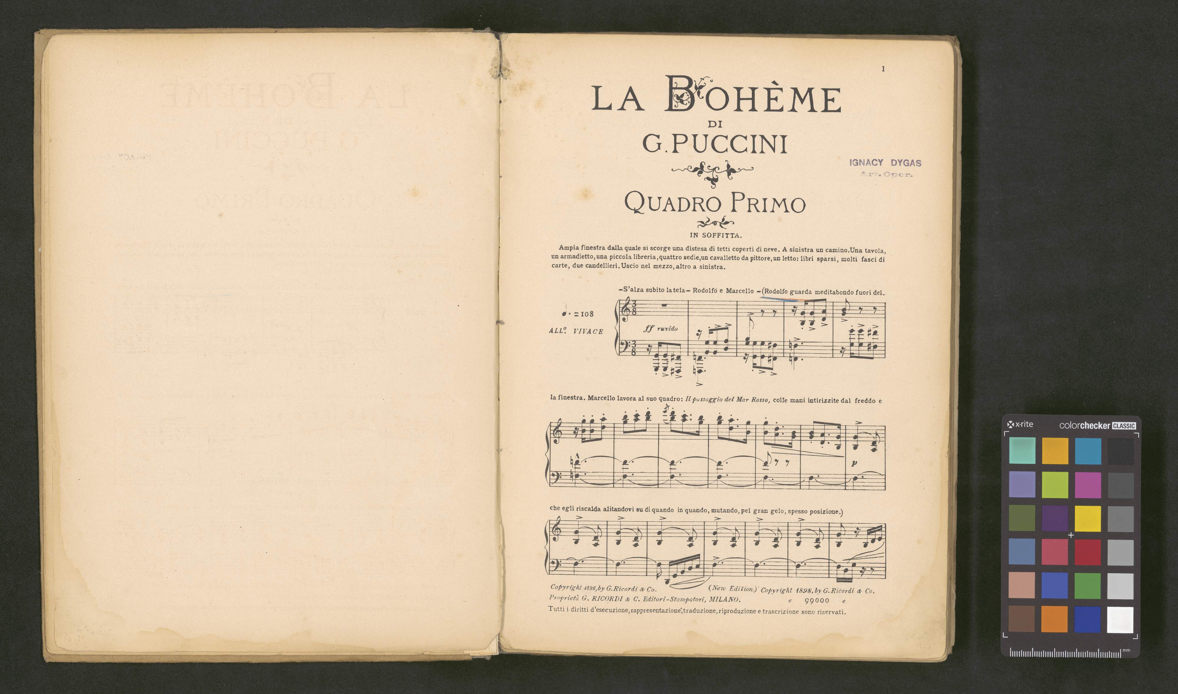 [title page:] LA BOHEME | (SCENE DA LA VIE DE BOHEME DI HENRY MURGER) | 4 QUADRI | DI | GISEPPE GIACOSA E LUIGI ILLICA | MUSICA DI | GIACOMO PUCCINI | Prima reppresentazione: Torino, Teatro Regio, I|o Febbraio 1896. | NUOVA EDIZIONE CON AGGIUNTE DELL'AUTORE | OPERA COMPLETA PER CANTO E PIANOFORTE | (A) Netti Fr. 15- | RIDUZIONE DI CARLO CARIGNANI | G.RICARDI &C. | EDITORI-STAMPATORI | MILANO - ROMA - NAPOLI - PALERMO - PARIGI - LONDRA | (PRINTED IN ITALY) | Copyright 1896, by G. Ricordi & Co. | (New Edition). Copyright 1898, by G. Ricordi & Co