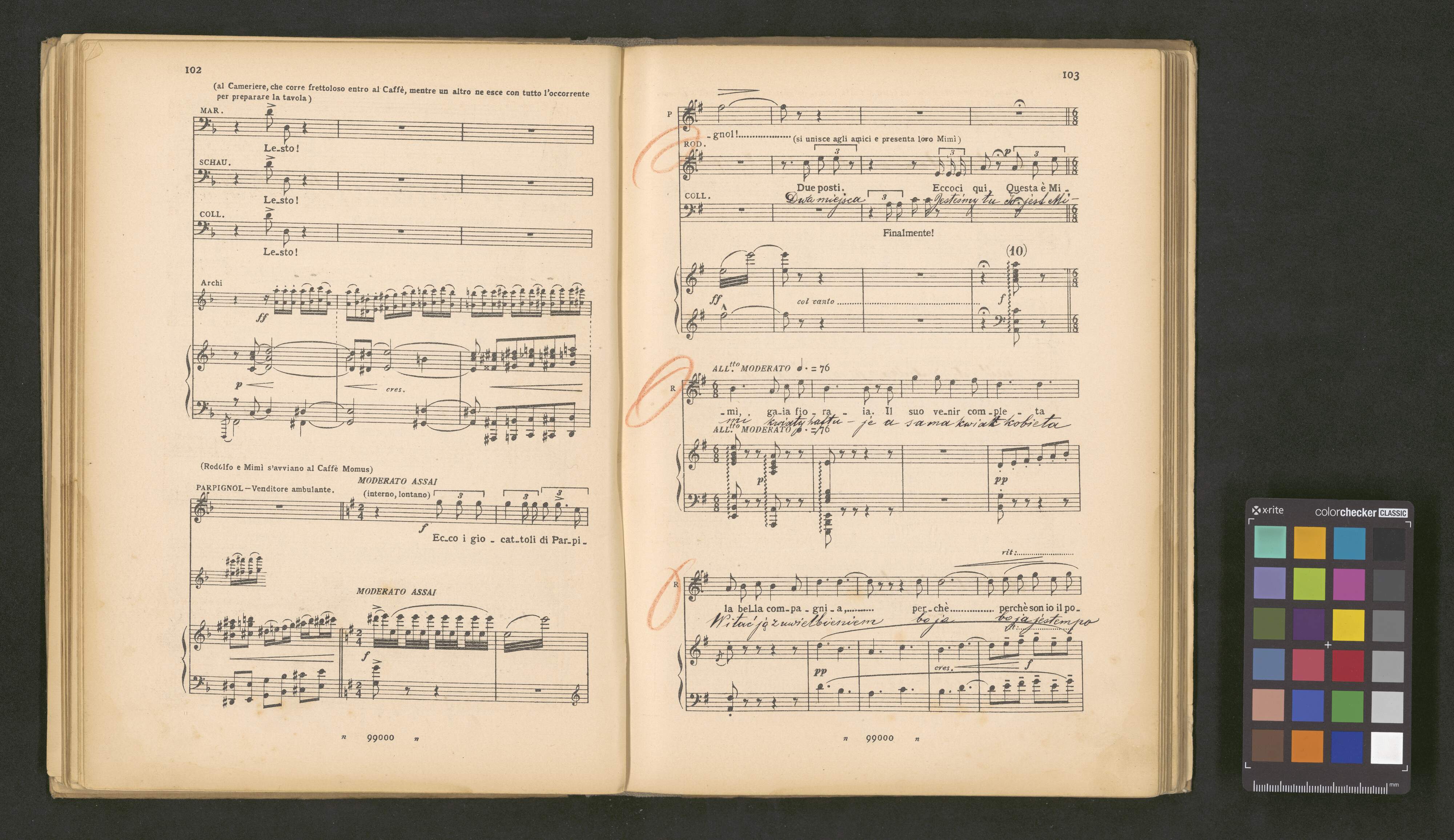 [title page:] LA BOHEME | (SCENE DA LA VIE DE BOHEME DI HENRY MURGER) | 4 QUADRI | DI | GISEPPE GIACOSA E LUIGI ILLICA | MUSICA DI | GIACOMO PUCCINI | Prima reppresentazione: Torino, Teatro Regio, I|o Febbraio 1896. | NUOVA EDIZIONE CON AGGIUNTE DELL'AUTORE | OPERA COMPLETA PER CANTO E PIANOFORTE | (A) Netti Fr. 15- | RIDUZIONE DI CARLO CARIGNANI | G.RICARDI &C. | EDITORI-STAMPATORI | MILANO - ROMA - NAPOLI - PALERMO - PARIGI - LONDRA | (PRINTED IN ITALY) | Copyright 1896, by G. Ricordi & Co. | (New Edition). Copyright 1898, by G. Ricordi & Co