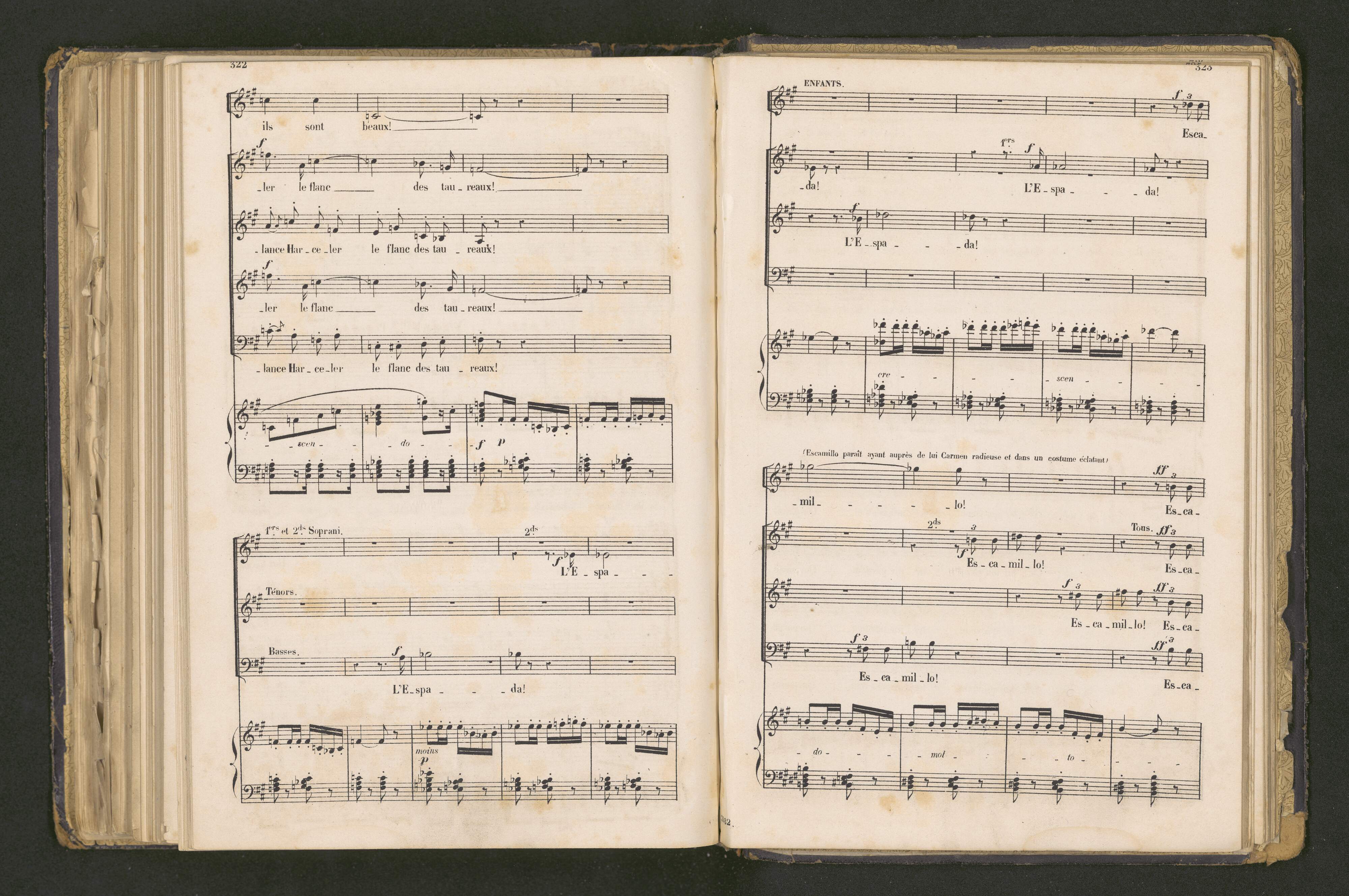 [title page:] à JULES PASDELOUP | CARMEN | Opéra Comique en 4 actes | Ture de la nouvelle | DE | PROSPER MÉRIMÉE | Poéme de | H. MEILHAC et L. HALÉVY. | Musique de | GEORGES BIZET | Paris, CHOUDENS PÉRE ET FILS. ÉDIT|E|S, | Rue S|t. Honoré. 265. prés l'Assomption. | propriété p|r. tous pays. | Droits Résérves | PARTITION Chant et Piano arrangée par L'AUTEUR