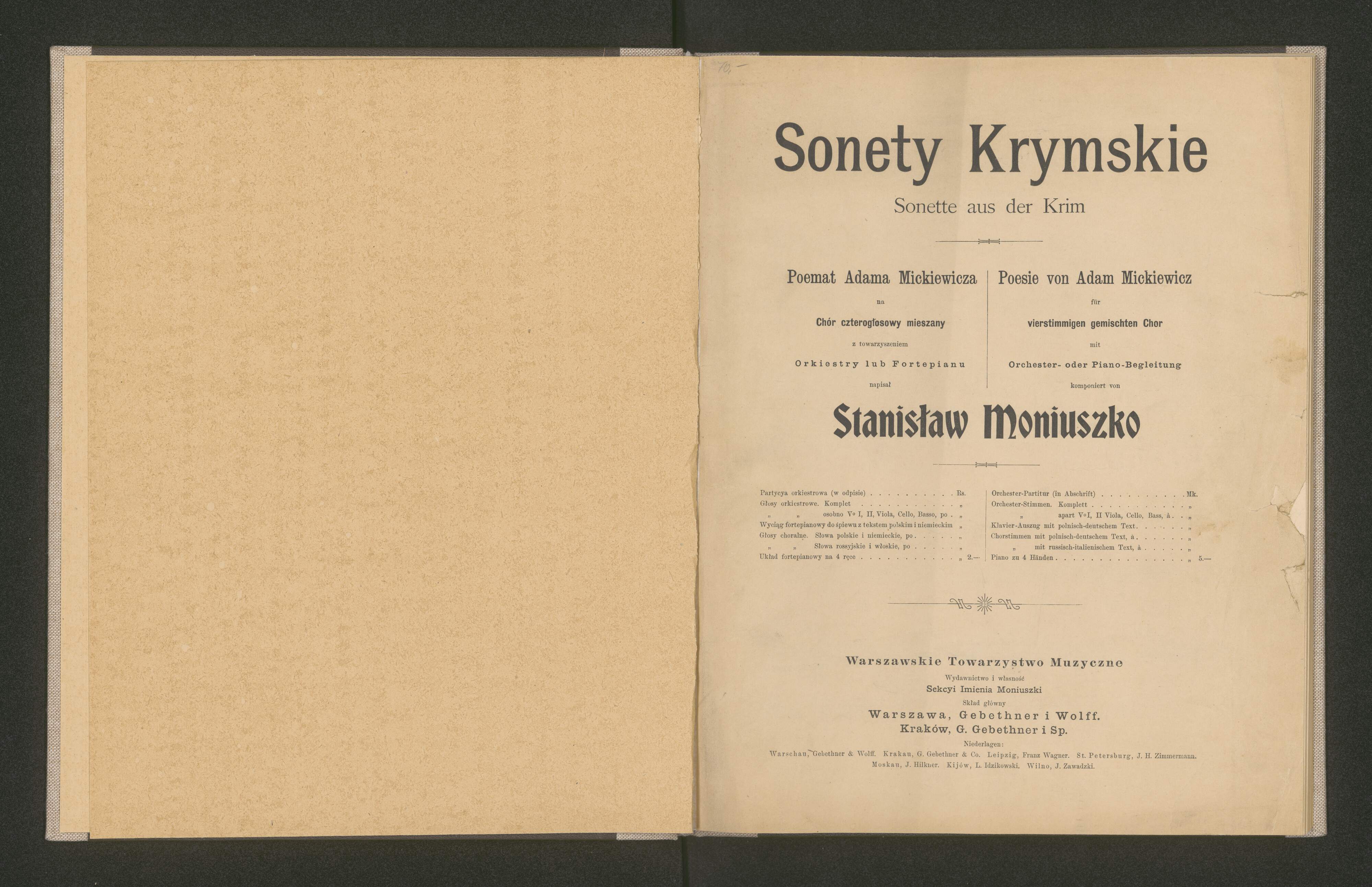 Sonety Krymskie | Sonette aus der Krim [left column:] Poemat Adama Mickiewicza | na | Chór czterogłosowy mieszany | z towarzyszeniem | Orkiestry lub Fortepianu | napisał [right column:] Poesie von Adam Mickiewicz | für | vierstimmigen gemischten Chor | mit | Orchester-oder Piano-Begleitung | komponiert von | Stanisław Moniuszko. [below price index of particular parts and arrangements] | Warszawskie Towarzystwo Muzyczne | Wydawnictwo i własność | Sekcyi Imienia Moniuszki | Skład główny | Warszawa, Gebethner i Wolff. | Kraków, G. Gebethner i Sp. | Niederlagen: | Warschau, Gebethner & Wolff. Krakau, G. Gebethner & Co. Leipzig, Franz Wagner. St. Petersburg, J. H. Zimmermann. | Moskau, J. Hilkner. Kijów, L. Idzikowski. Wilno, J. Zawadzki