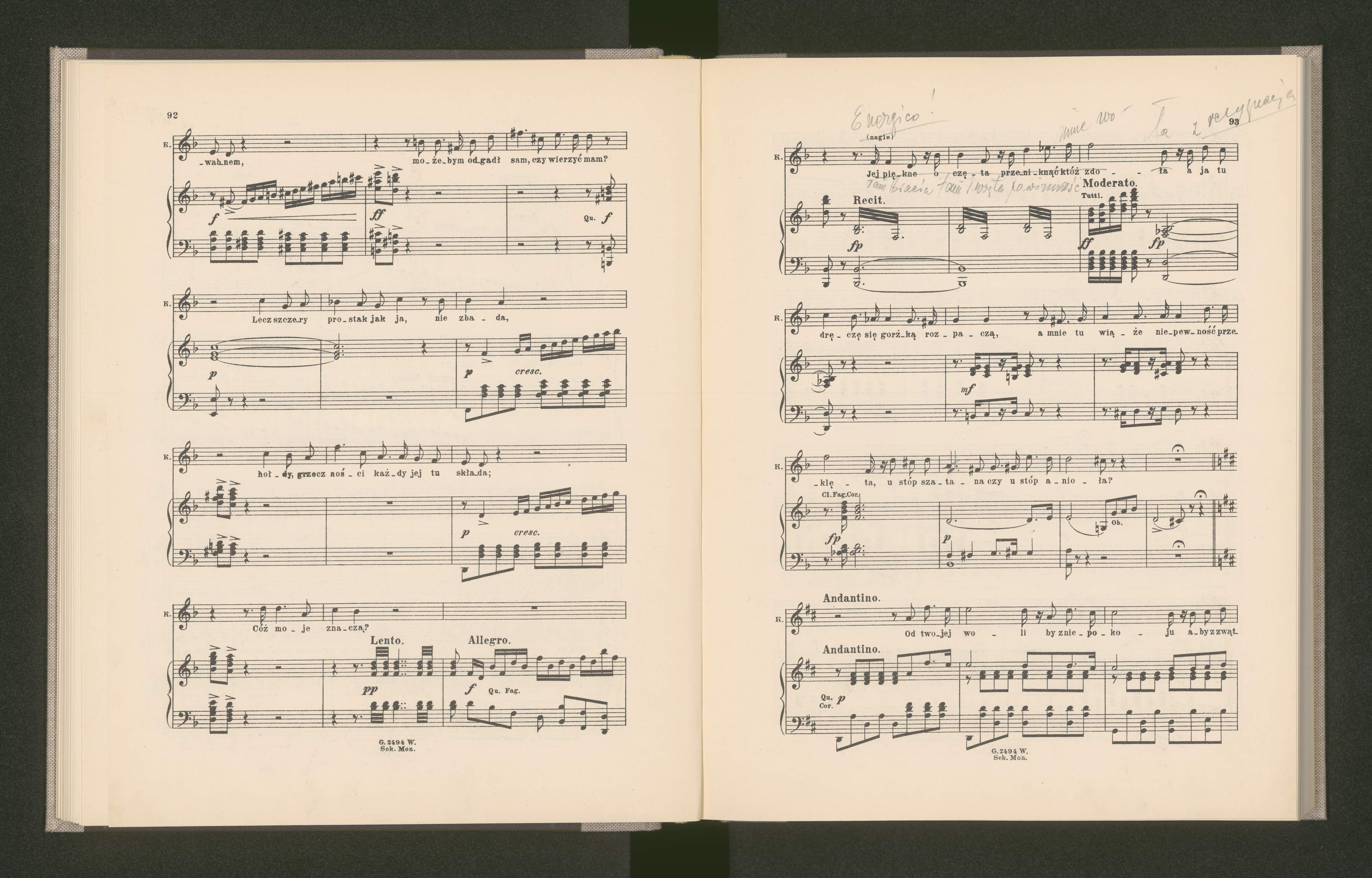 [title page:] HRABINA | OPERA W TRZECH AKTACH | SŁOWA WŁODZIMIERZA WOLSKIEGO | MUZYKĘ NAPISAŁ | Stanisław Moniuszko | WYCIĄG FORTEPIANOWY DO ŚPIEWU | ułożony z partytury orkiestrowéj przez | GUSTAWA ROGUSKIEGO | WYDAWNICTWO | Sekcyi imienia Stanisława Moniuszki | przy Towarzystwie Muzycznem w Warszawie | z funduszu, ofiarowanego przez | EMILA MŁYNARSKIEGO | Dyrektora opery Warszawskiej | Cena R. 10 net. | SKŁAD GŁÓWNY: | Warszawa, Gebethner i Wolff | Kraków, G. Gebethner i Sp
