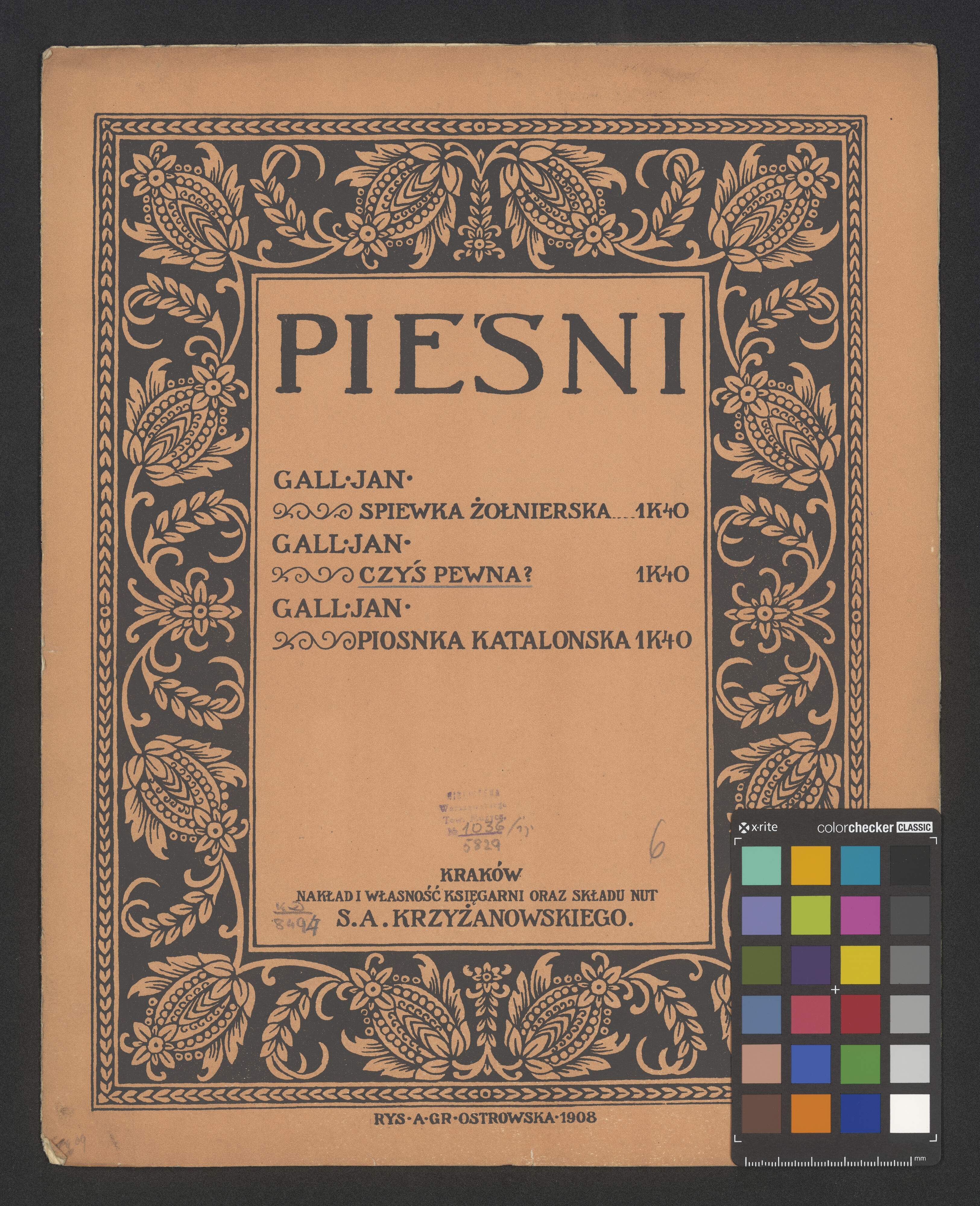 PIEŚNI | [list of 3 Songs of Jan Gal] | KRAKÓW | NAKŁAD I WŁASNOŚĆ KSIĘGARNI ORAZ SKŁADU NUT | S. A. KRZYŻANOWSKIEGO | RYS. A. GR. OSTROWSKA 1908