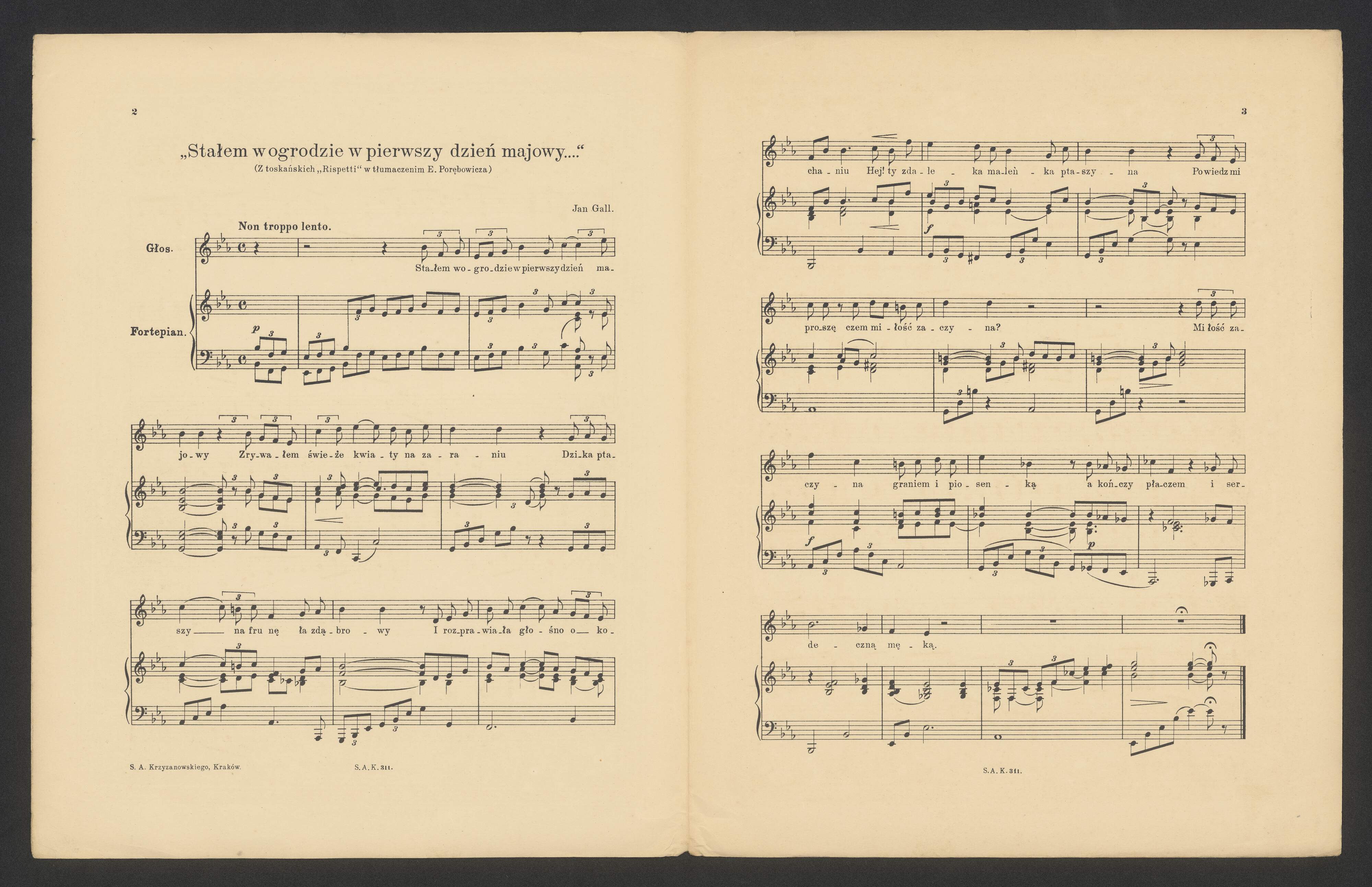 [p. 2, heading:] "Stałem w ogrodzie w pierwszy dzień majowy...." | (Z toskańskich "Rispetti" w tłumaczeniu E. Porębowicza.) | » Jan Gall