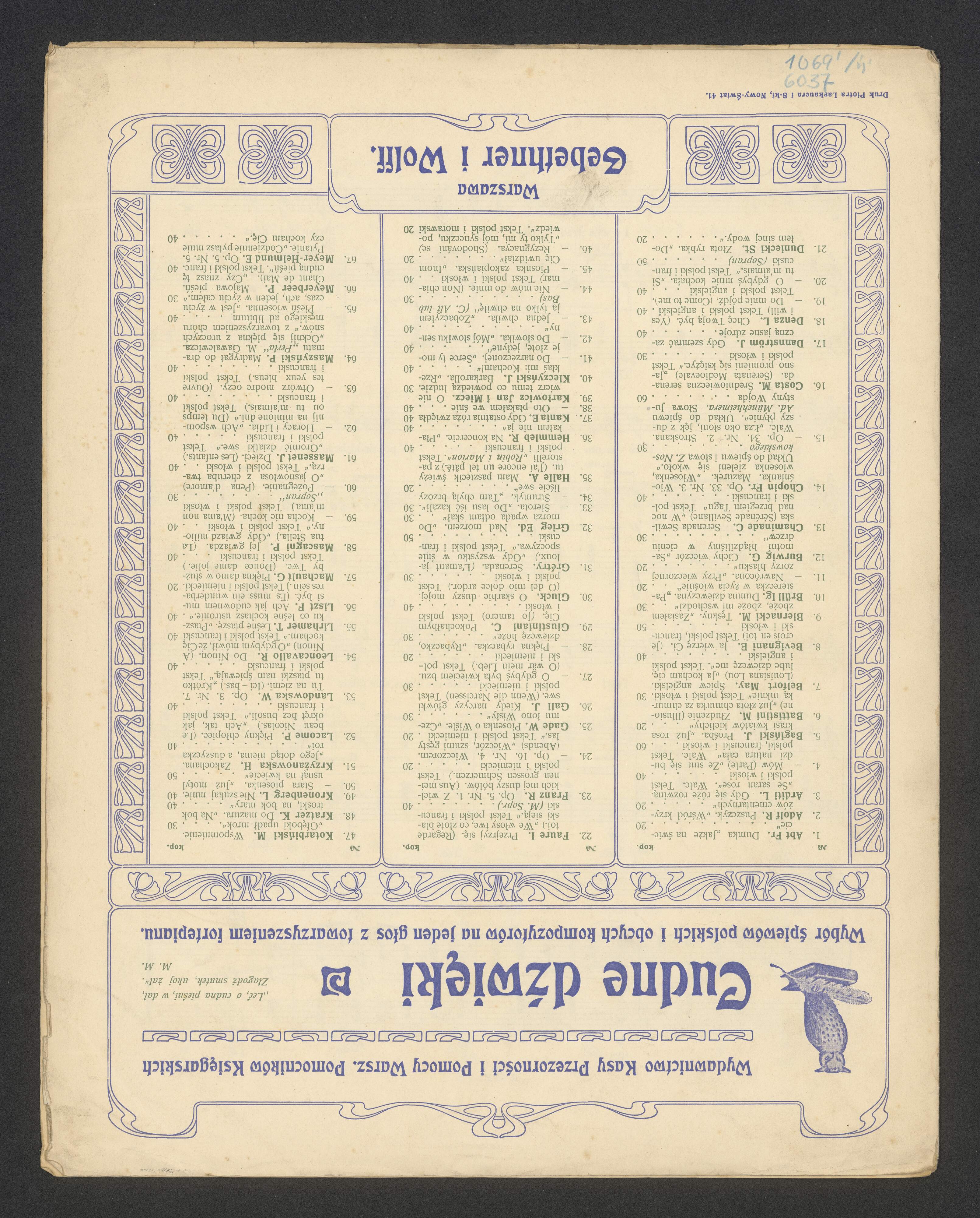 [title page:] Wydawnictwo Kasy Przezorności i Pomocy Warsz. Pomocników Księgarskich | ,,Leć o cudna pieśni, w dal, | Złagodź smutek, ukój żal". | M. M. | Cudne dźwięki | Wybór śpiewów polskich i obcych kompozytorów na jeden głos z towarzyszeniem fortepianu. | [a list of works by different composers published within the series, among them: 71. Mikulski T. Marzenie. Mazurek. ,,W cudny wieczór pośród drzew".] | Warszawa | Gebethner i Wolff. | Дозв. Ценз. Варшава, 22 июня 1904 года