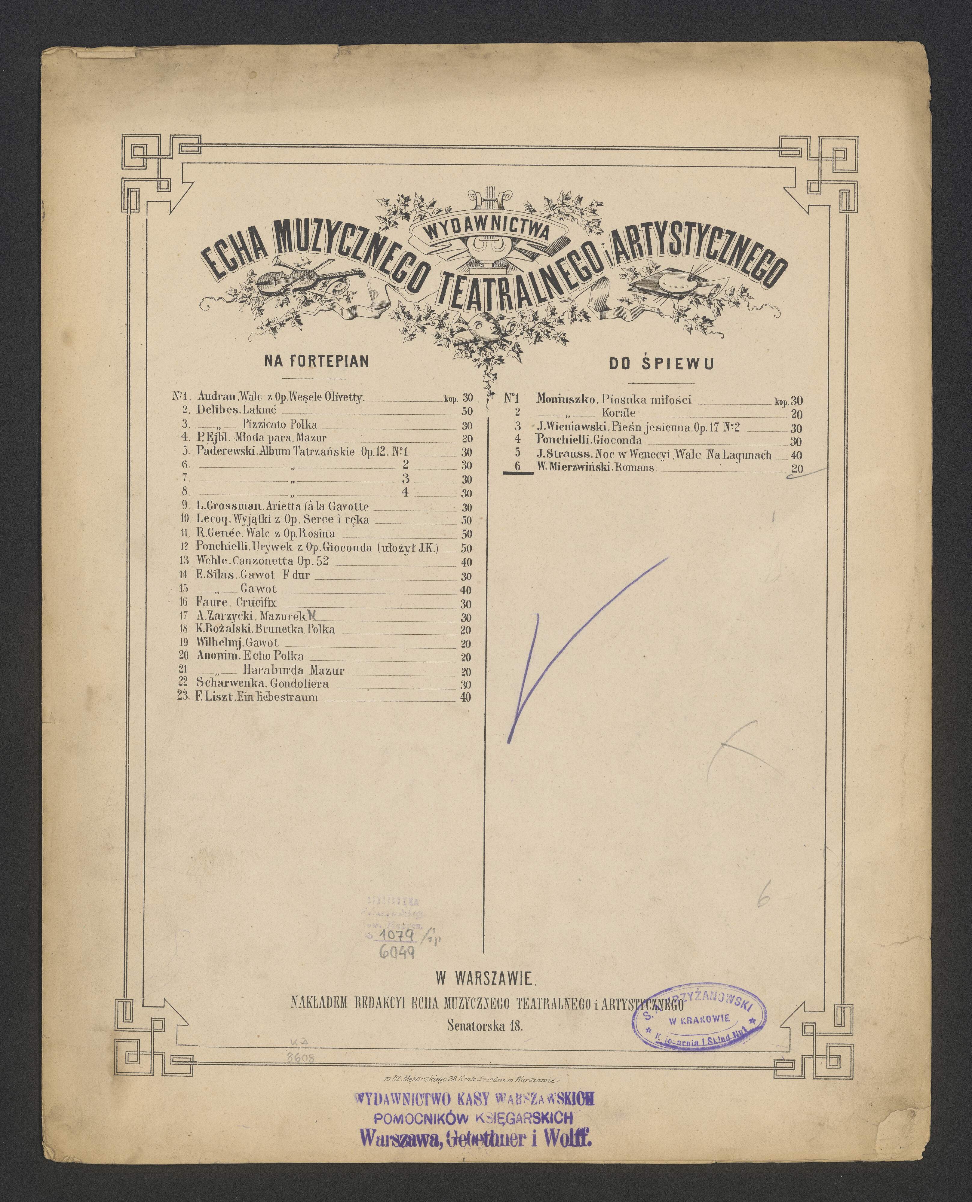 WYDAWNICTWA | ECHA MUZYCZNEGO TEATRALNEGO i ARTYSTYCZNEGO | [publisher's catalogue] | W WARSZAWIE. | NAKŁADEM REDAKCYI ECHA MUZYCZNEGO TEATRALNEGO i ARTYSTYCZNEGO | Sentaorska 18. | w. lit. Mękarskiego 38 Krak.Przedm.w Warszawie