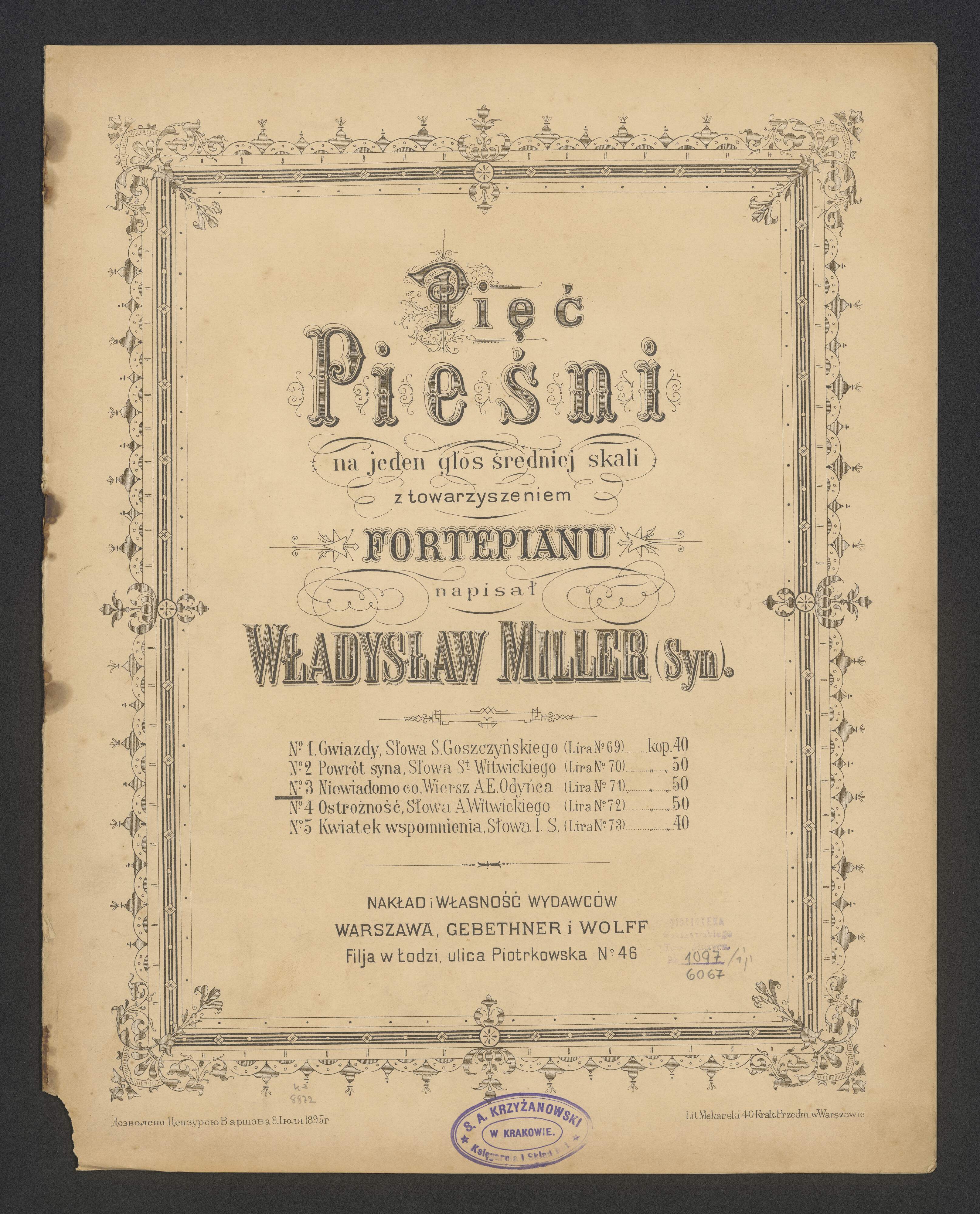 [cover title:] Pięć | Pieśni | na jeden głos średniej skali | z towarzyszeniem | FORTEPIANU | napisał | WŁADYSŁAW MILLER (Syn). | [list of 5 songs] | NAKŁAD I WŁASNOŚĆ WYDAWCÓW | WARSZAWA, GEBETHNER i WOLFF | Filja w Łodzi, ulica Piotrkowska N|o. 46 | Дозволено Цензурую Варшава 8. Июля 1895 г. [space] Lit. Mękarski 40 Krak. Przedm. wWarszawie