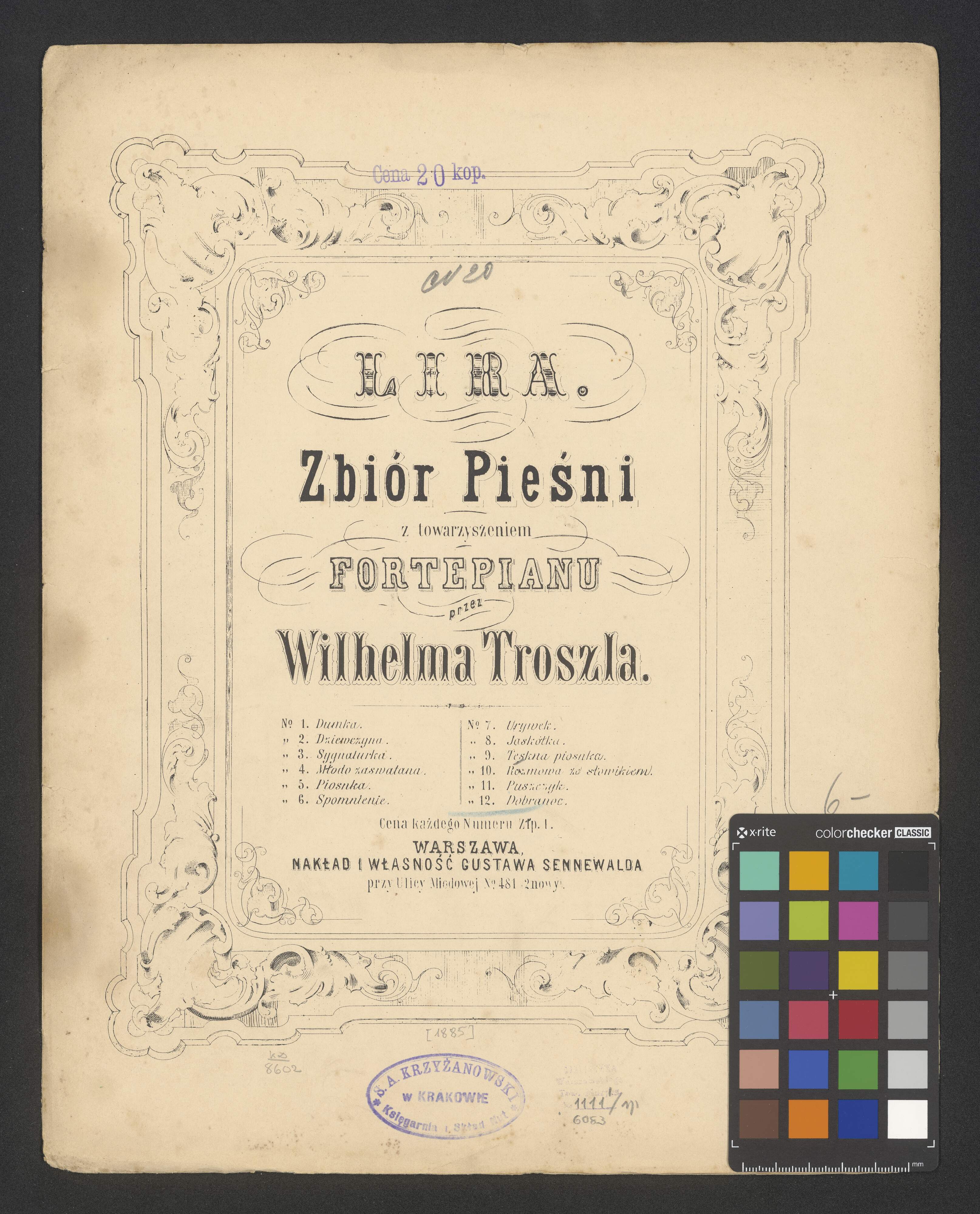 [title page:] LIRA | Zbiór Pieśni | z towarzyszeniem | FORTEPIANU | przez | Wilhelma Troszla. | [on the left side:] N|o. 1. Dumka. | ,, 2. Dziewczyna. | ,, 3. Sygnaturka. | ,, 4. Młodo zaswatana. [!] | ,, 5. Piosnka. | ,, 6. Spomnienie. [!] | [on the right side:] N|o. 7. Urywek. | ,, 8. Jaskółka. | ,, 9. Tęskna piosnka. | ,, 10. Rozmowa ze słowikiem. | ,, 11. Puszczyk. | ,, 12. Dobranoc. | [back in the middle:] Cena każdego Numeru Złp. 1. | WARSZAWA | NAKŁAD I WŁASNOŚĆ GUSTAWA SENNEWALDA | przy Ulicy Miodowej N|o. 481 2 nowy