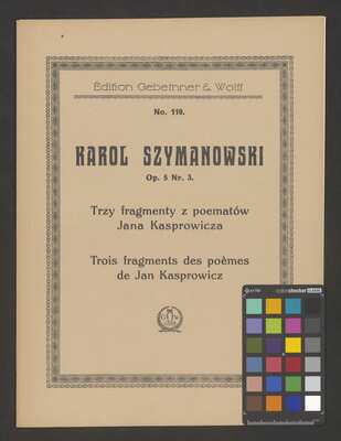 1 score 1 piece from the collection of 3 songs, [pl-text: cały zbiór zawiera następujące tytuły: 1. Święty Boże 2. Jestem i płaczę 3. Błogosławioną niech będzie ta chwila], [pl-text: Egzemplarz zawiera trzecią ze zbioru pieśni ujętych w op. 5 Karola Szymanowskiego]
