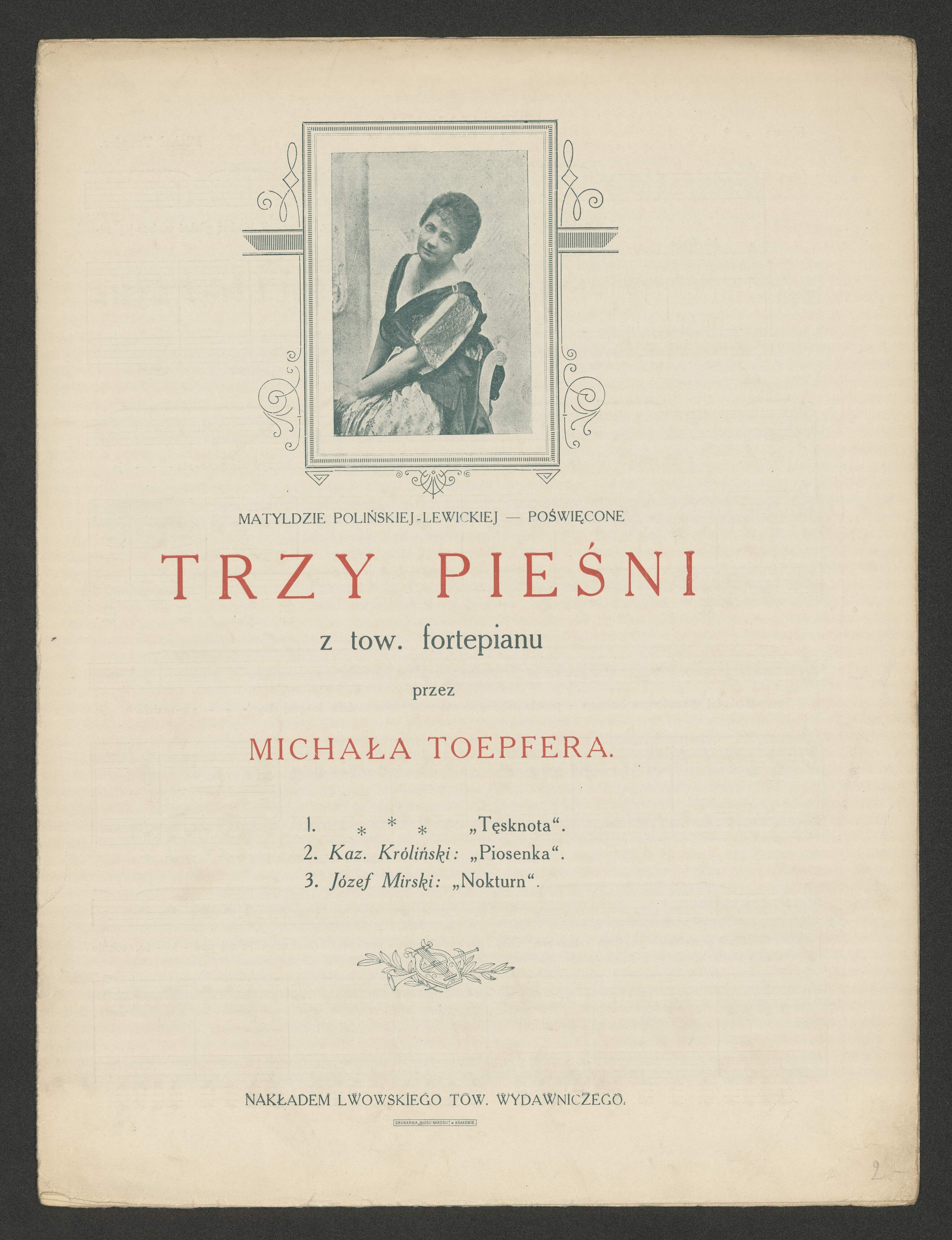 [page title:] MATYLDZIE POLIŃSKIEJ-LEWICKIEJ - POŚWIĘCONE | TRZY PIEŚNI | z tow. fortepianu | przez | MICHAŁA TOEPERA. | 1. *** "Tęsknota". | 2. Kaz. Króliński: "Piosenka". | 3. Józef Mirski: | Nokturn"