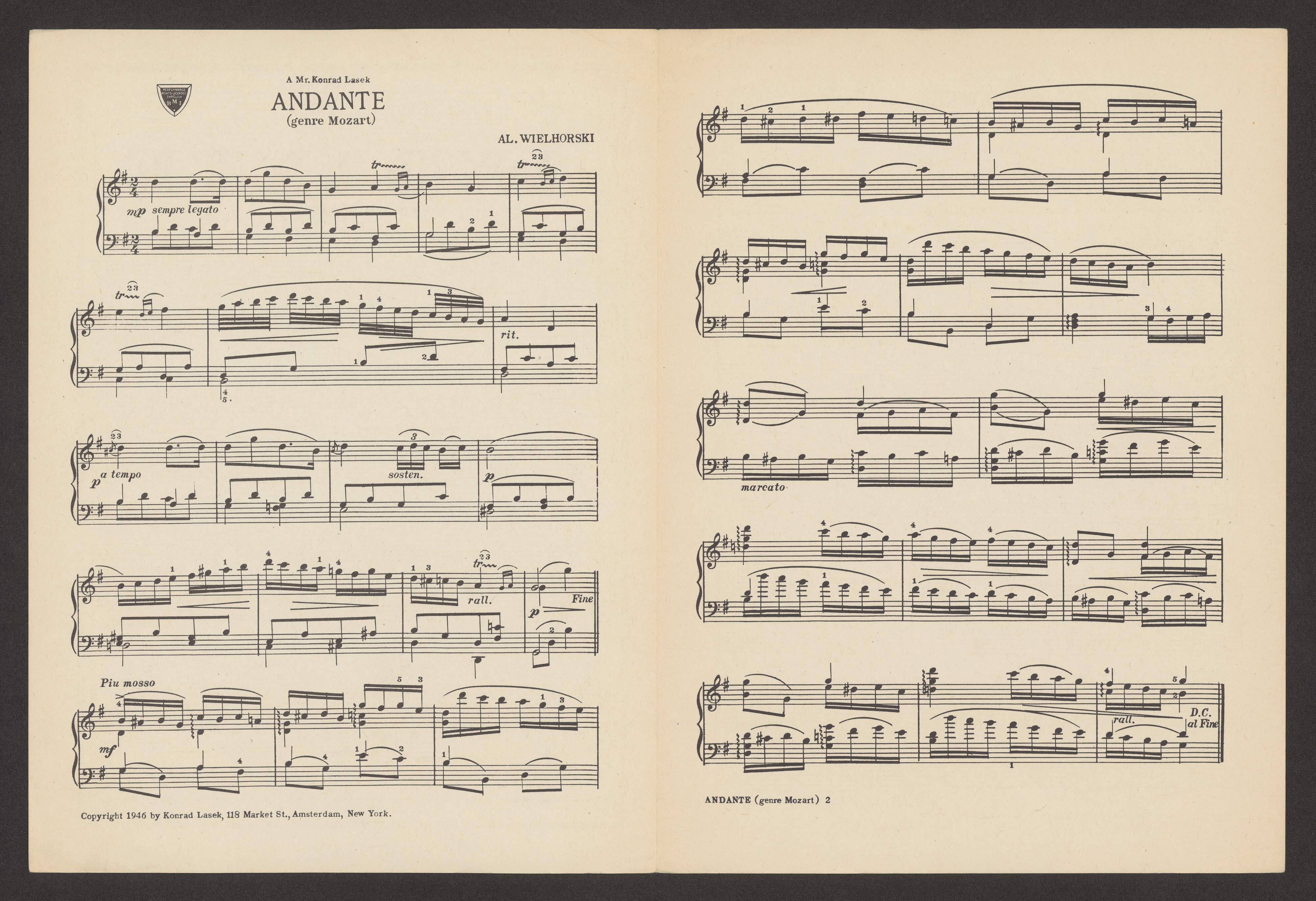 [title page:] ANDANTE | [genre Mozart] | AL. WIELHORSKI | KONRAD LASEK | 118 Market St. | Amsterdam, New York | PRINTED IN U. S. A