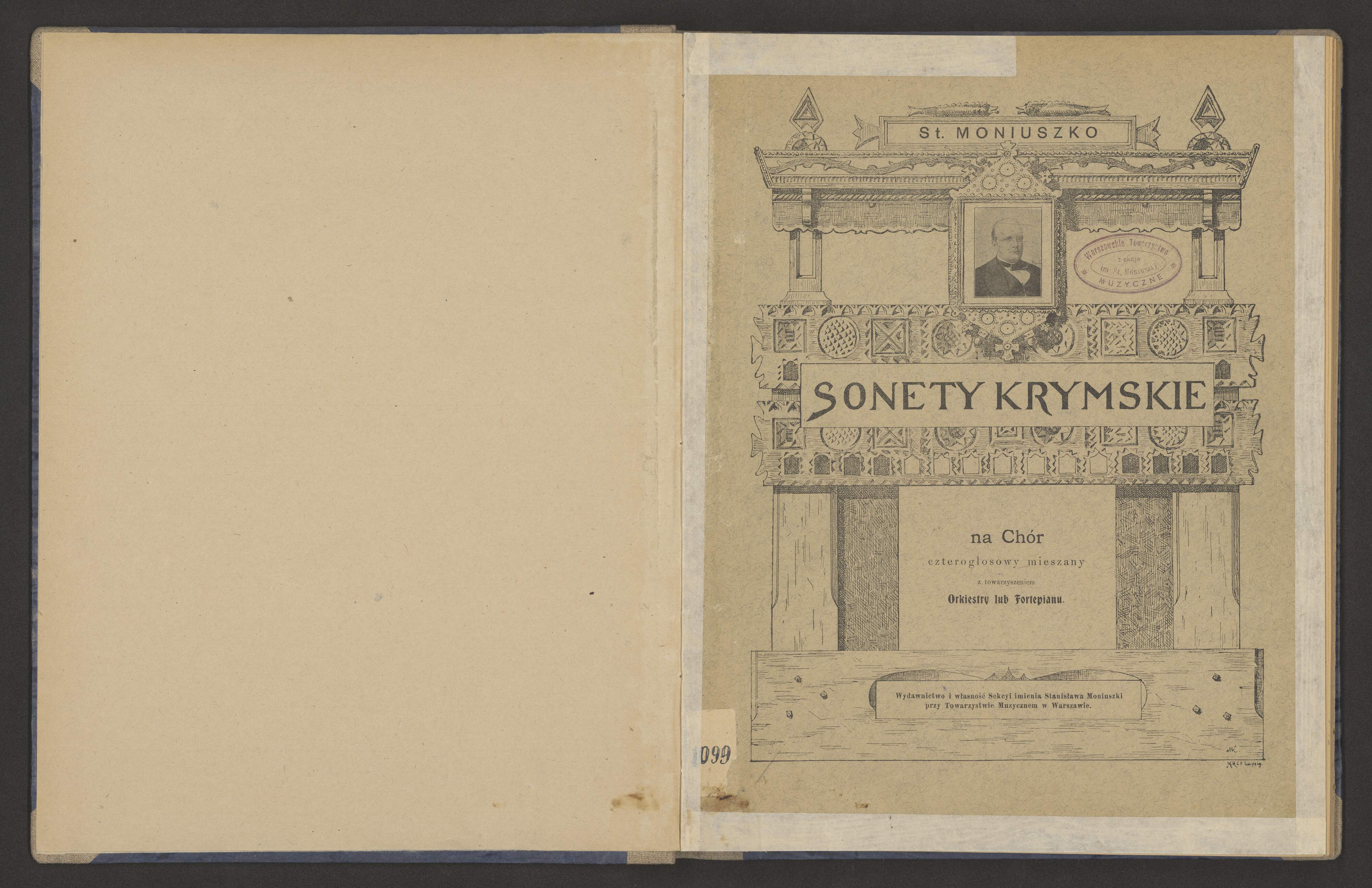 [cover title:] S. MONIUSZKO | SONETY KRYMSKIE | na Chór | czterogłosowy mieszany | z towarzyszeniem | Orkiestry lub Fortepianu | Warszawskie Towarzystwo Muzyczne. | Wydawnictwo i własność Sekcyi Imienia Moniuszki. | M. R. C|o Leipzig