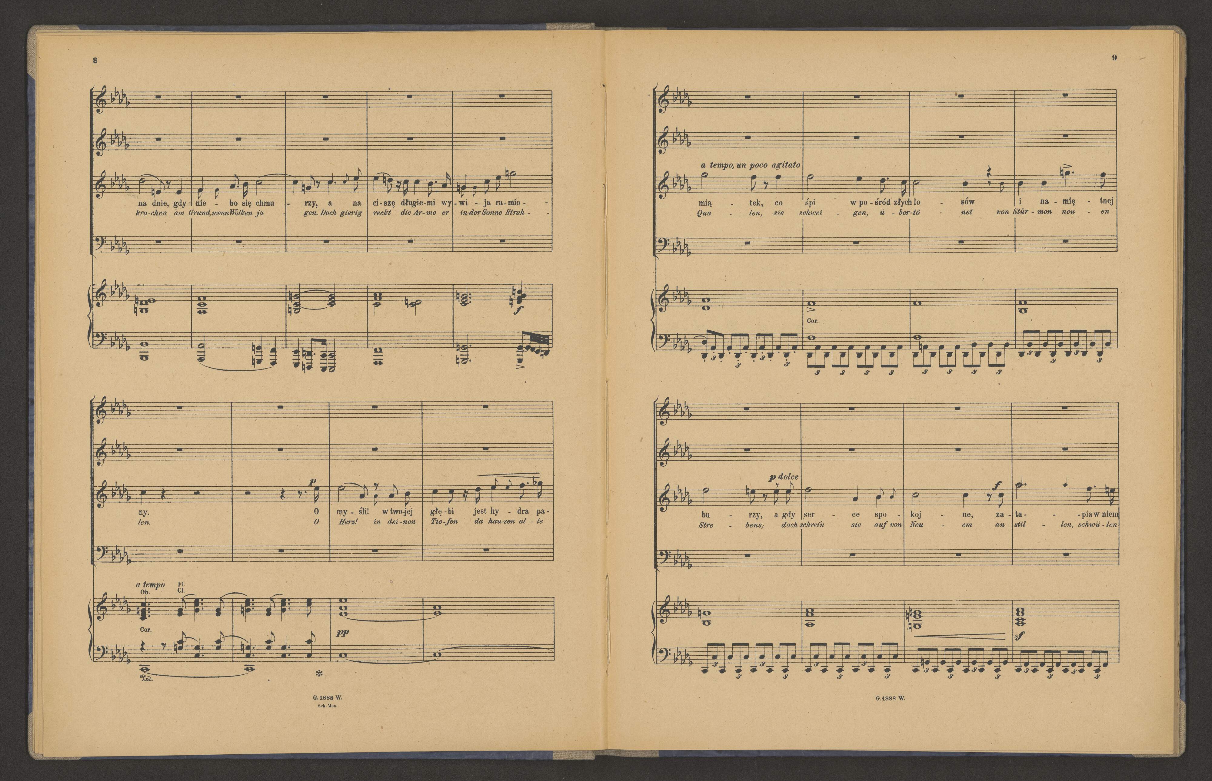 [cover title:] S. MONIUSZKO | SONETY KRYMSKIE | na Chór | czterogłosowy mieszany | z towarzyszeniem | Orkiestry lub Fortepianu | Warszawskie Towarzystwo Muzyczne. | Wydawnictwo i własność Sekcyi Imienia Moniuszki. | M. R. C|o Leipzig