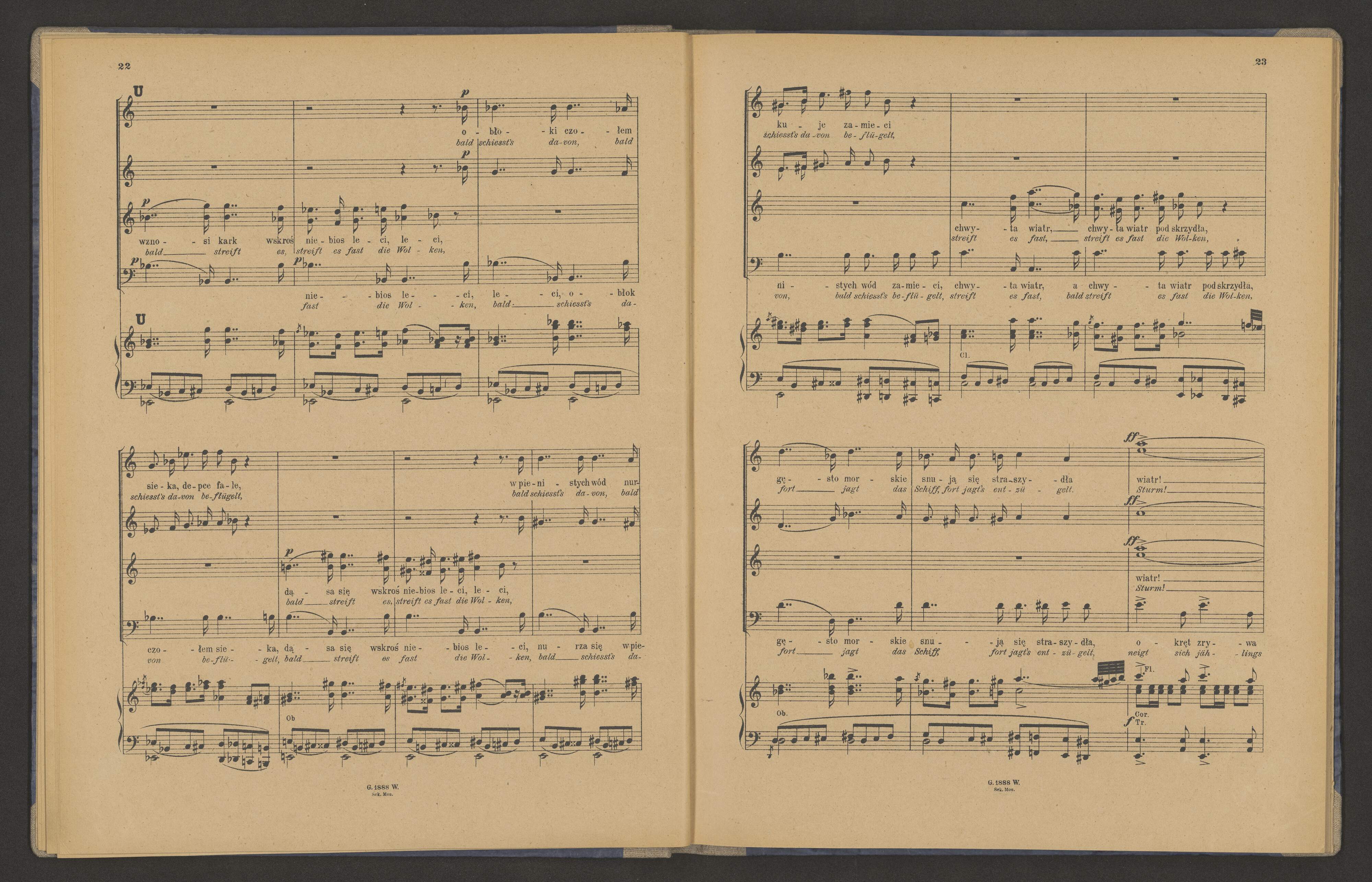 [cover title:] S. MONIUSZKO | SONETY KRYMSKIE | na Chór | czterogłosowy mieszany | z towarzyszeniem | Orkiestry lub Fortepianu | Warszawskie Towarzystwo Muzyczne. | Wydawnictwo i własność Sekcyi Imienia Moniuszki. | M. R. C|o Leipzig