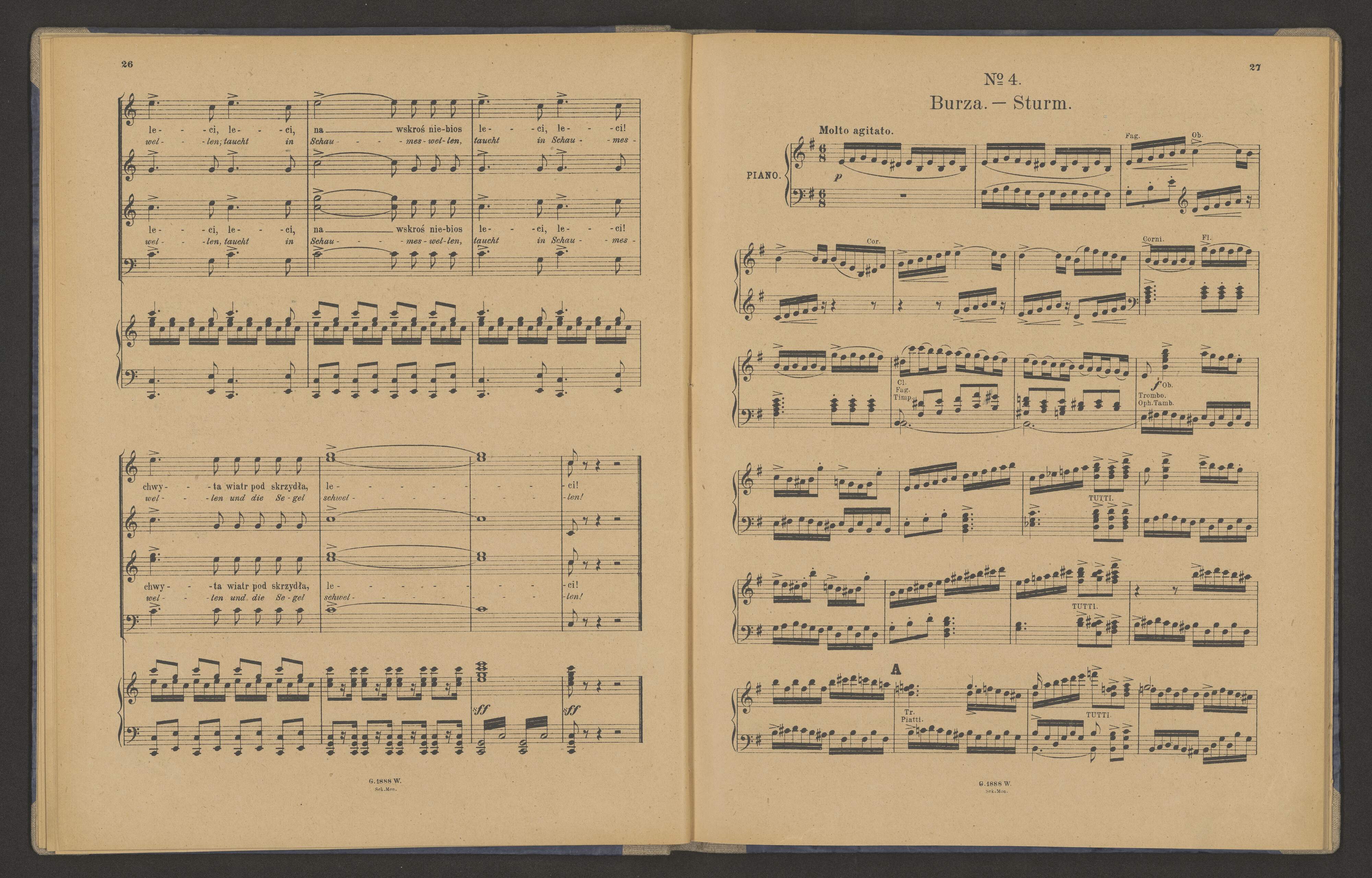 [cover title:] S. MONIUSZKO | SONETY KRYMSKIE | na Chór | czterogłosowy mieszany | z towarzyszeniem | Orkiestry lub Fortepianu | Warszawskie Towarzystwo Muzyczne. | Wydawnictwo i własność Sekcyi Imienia Moniuszki. | M. R. C|o Leipzig