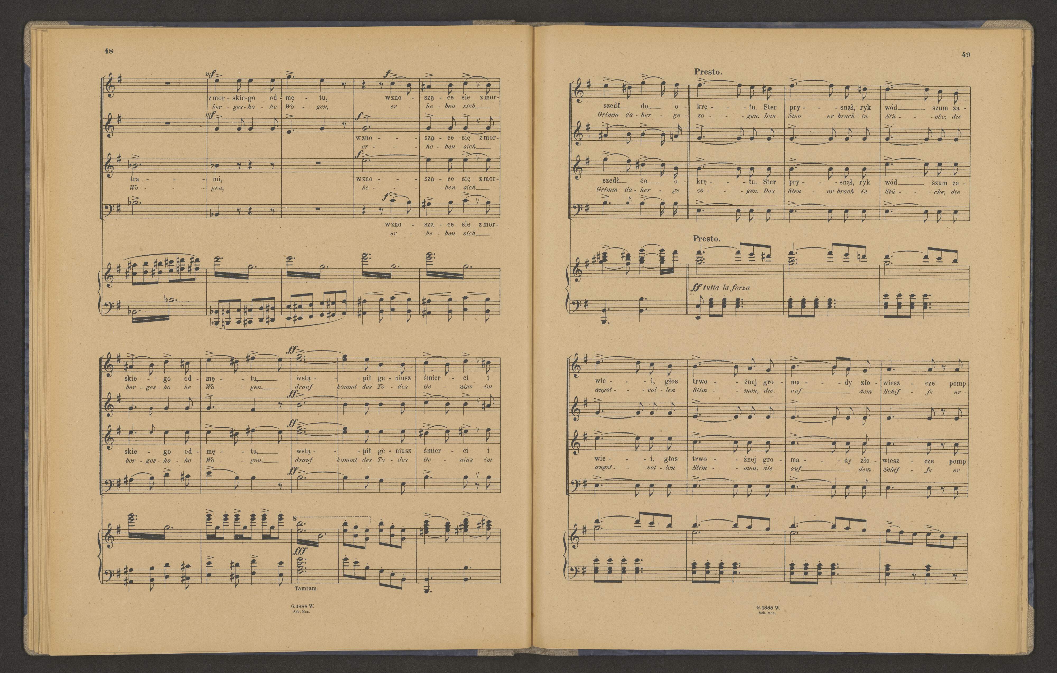 [cover title:] S. MONIUSZKO | SONETY KRYMSKIE | na Chór | czterogłosowy mieszany | z towarzyszeniem | Orkiestry lub Fortepianu | Warszawskie Towarzystwo Muzyczne. | Wydawnictwo i własność Sekcyi Imienia Moniuszki. | M. R. C|o Leipzig