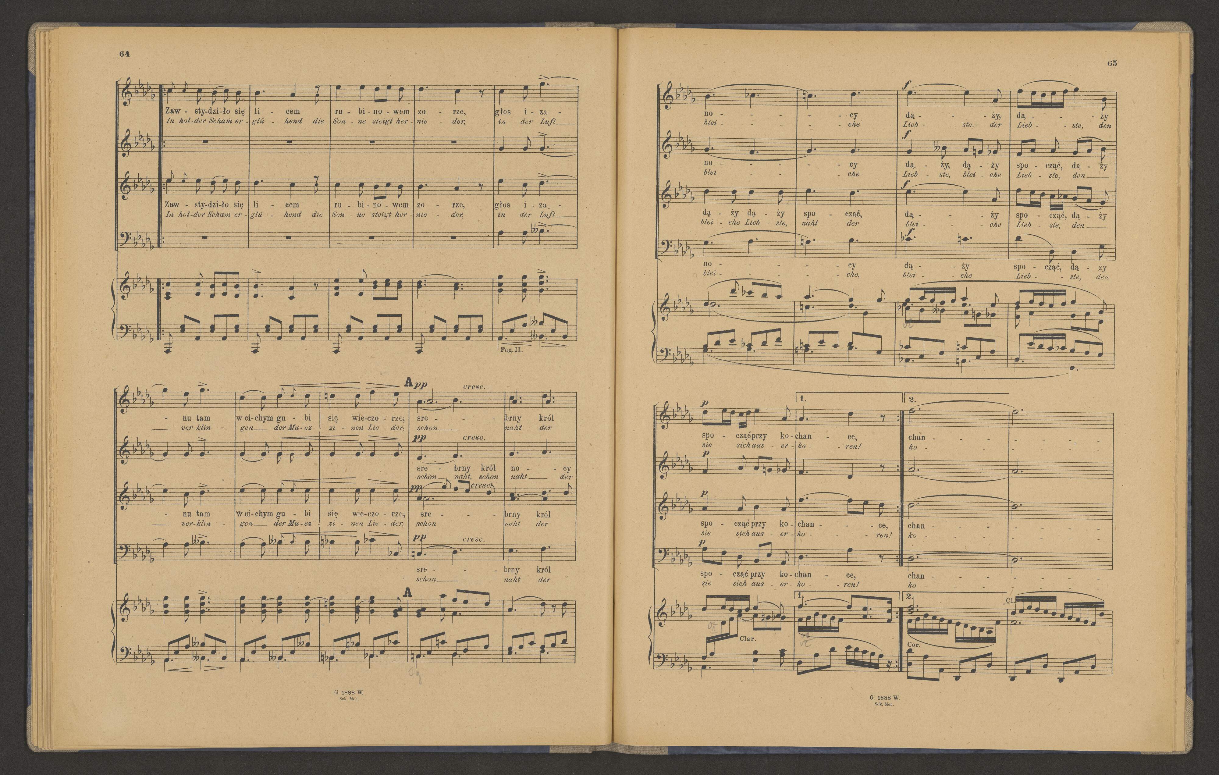 [cover title:] S. MONIUSZKO | SONETY KRYMSKIE | na Chór | czterogłosowy mieszany | z towarzyszeniem | Orkiestry lub Fortepianu | Warszawskie Towarzystwo Muzyczne. | Wydawnictwo i własność Sekcyi Imienia Moniuszki. | M. R. C|o Leipzig