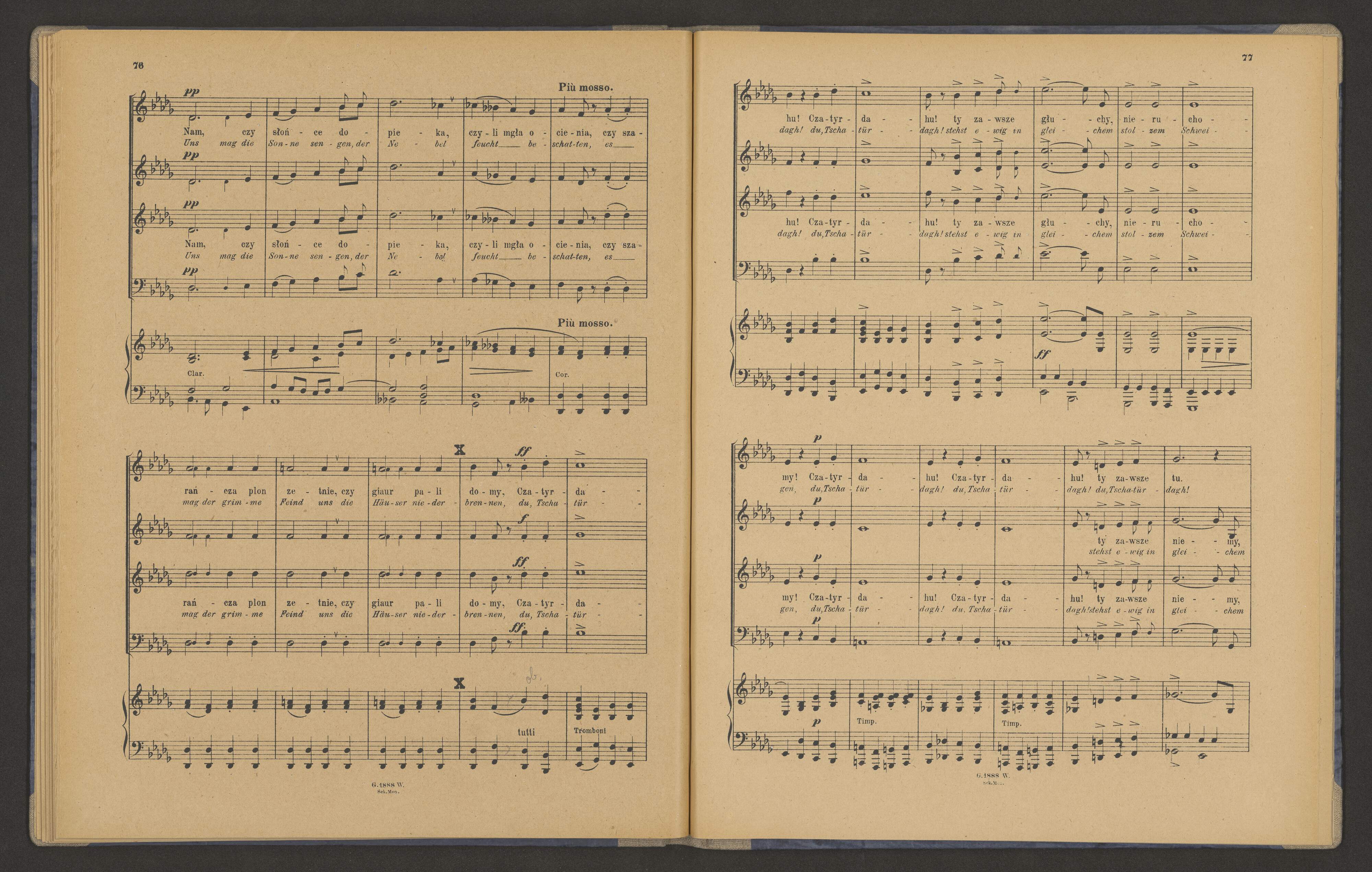 [cover title:] S. MONIUSZKO | SONETY KRYMSKIE | na Chór | czterogłosowy mieszany | z towarzyszeniem | Orkiestry lub Fortepianu | Warszawskie Towarzystwo Muzyczne. | Wydawnictwo i własność Sekcyi Imienia Moniuszki. | M. R. C|o Leipzig