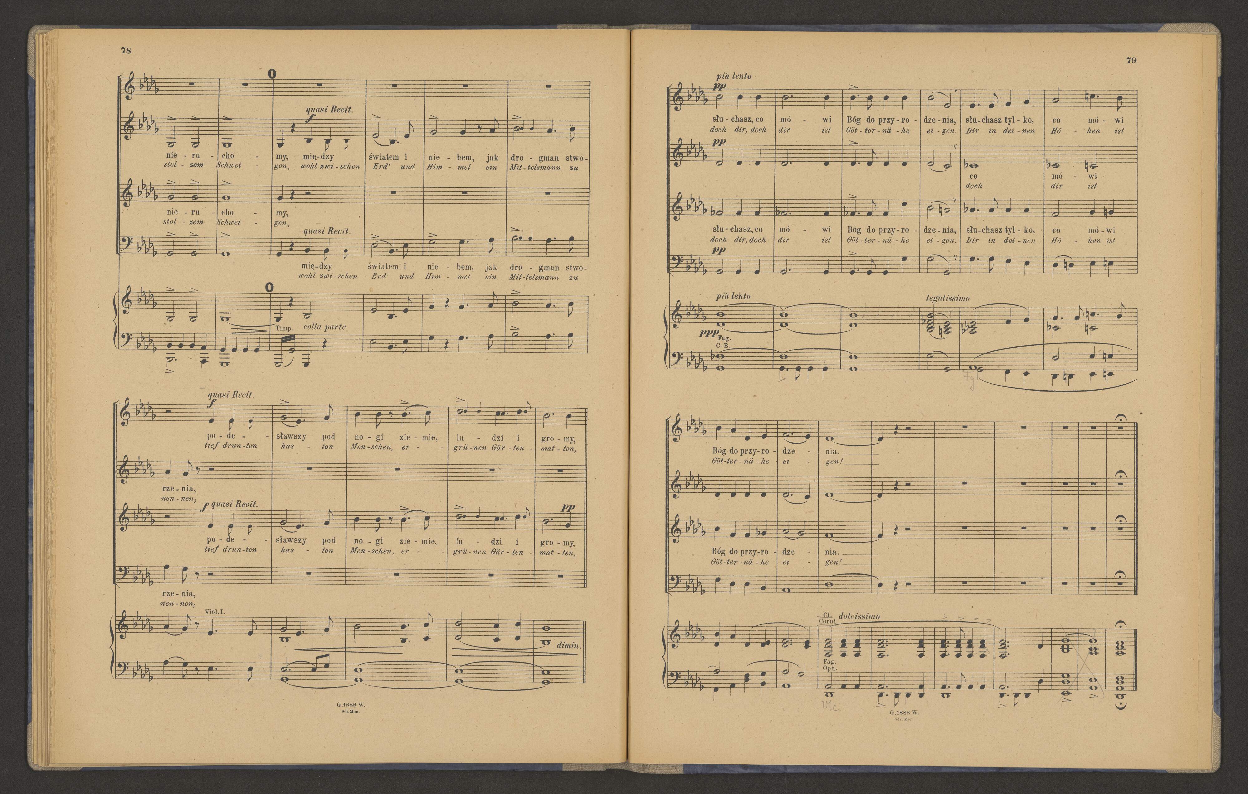 [cover title:] S. MONIUSZKO | SONETY KRYMSKIE | na Chór | czterogłosowy mieszany | z towarzyszeniem | Orkiestry lub Fortepianu | Warszawskie Towarzystwo Muzyczne. | Wydawnictwo i własność Sekcyi Imienia Moniuszki. | M. R. C|o Leipzig