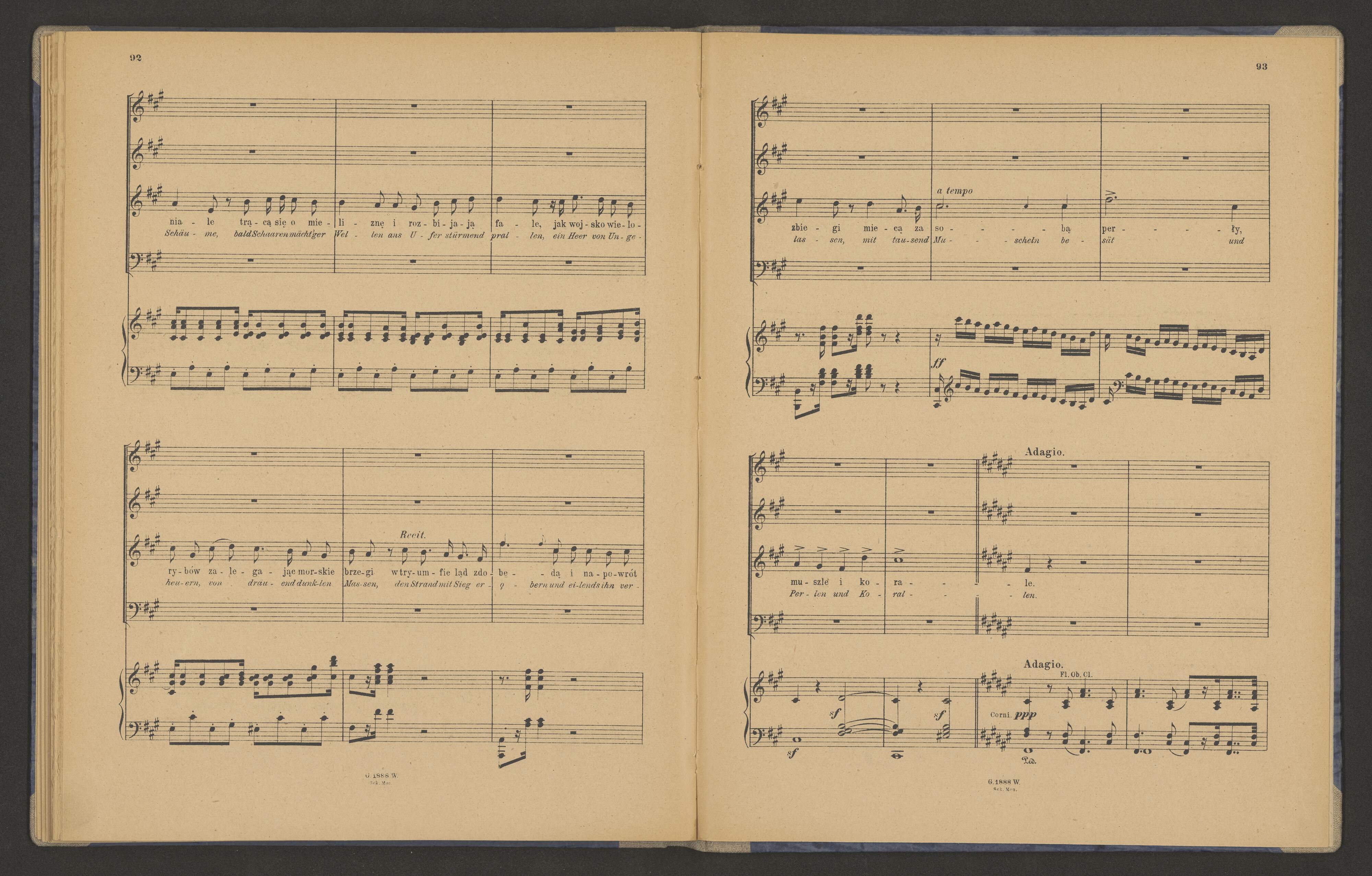 [cover title:] S. MONIUSZKO | SONETY KRYMSKIE | na Chór | czterogłosowy mieszany | z towarzyszeniem | Orkiestry lub Fortepianu | Warszawskie Towarzystwo Muzyczne. | Wydawnictwo i własność Sekcyi Imienia Moniuszki. | M. R. C|o Leipzig