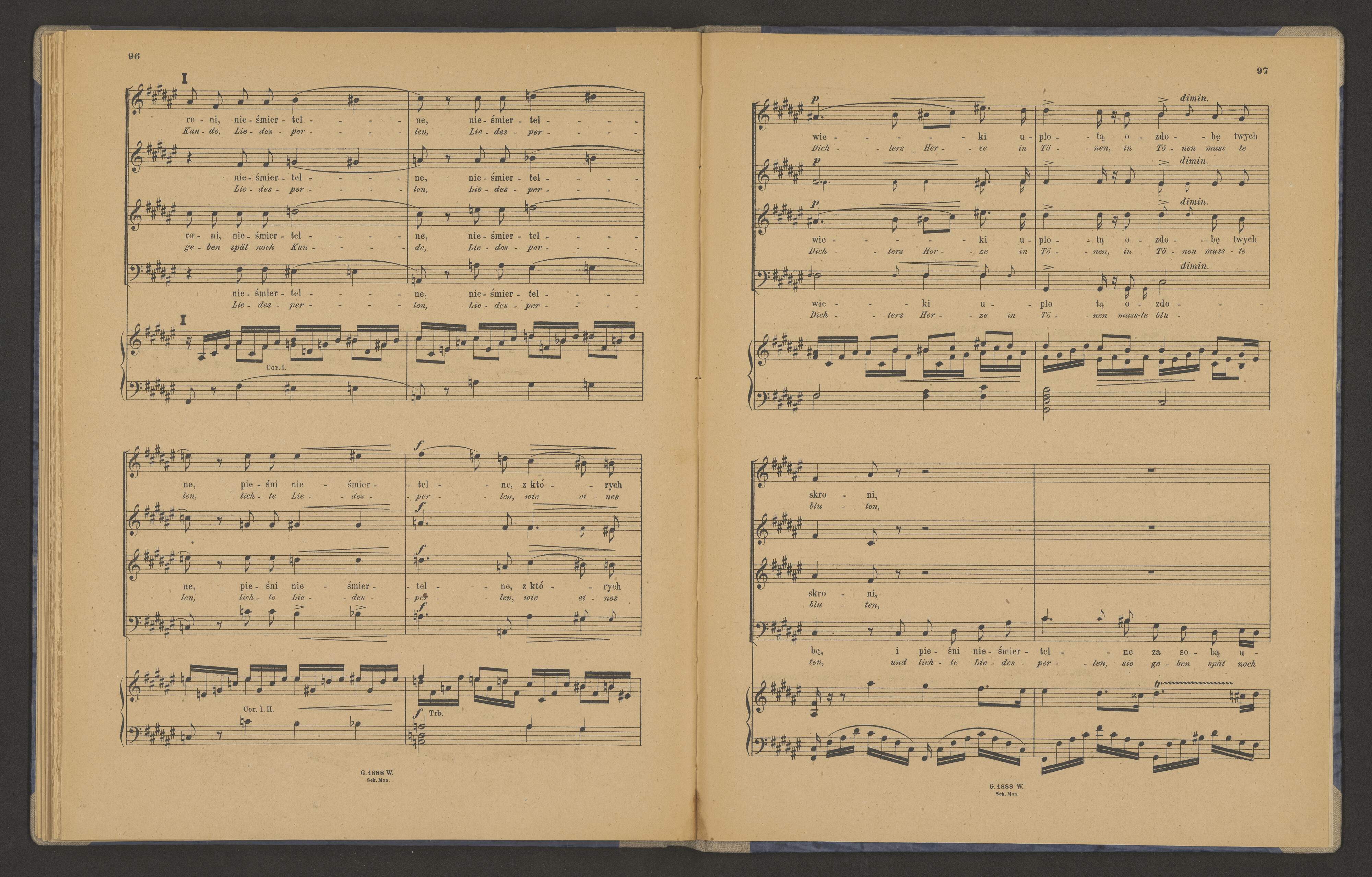 [cover title:] S. MONIUSZKO | SONETY KRYMSKIE | na Chór | czterogłosowy mieszany | z towarzyszeniem | Orkiestry lub Fortepianu | Warszawskie Towarzystwo Muzyczne. | Wydawnictwo i własność Sekcyi Imienia Moniuszki. | M. R. C|o Leipzig