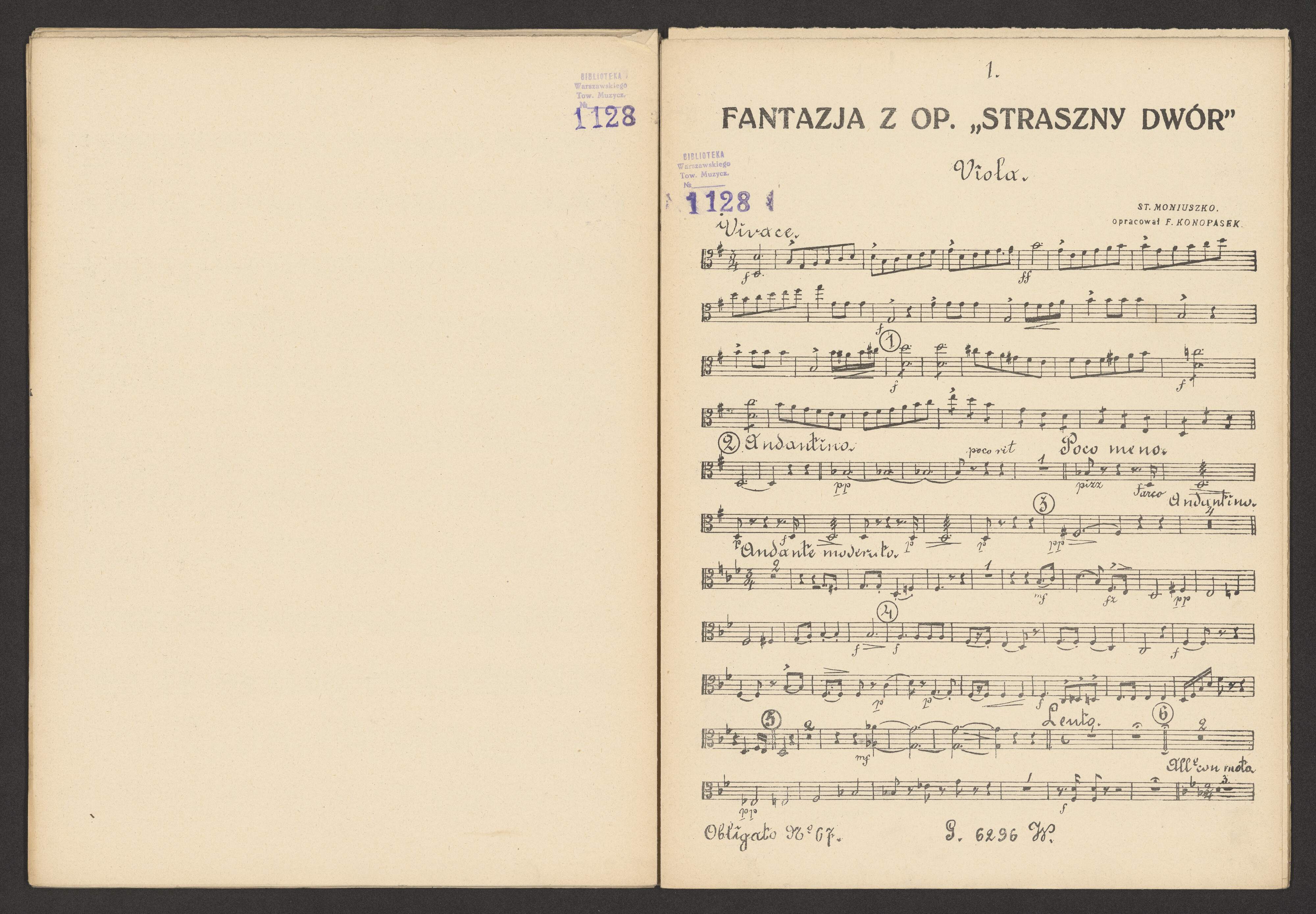 [title page:] STANISŁAW MONIUSZKO | FANTAZJA | z Opery | Straszny Dwór | Opracował | na orkiestrę salonową | FELIKS KONOPASEK | NAKŁAD I WŁASNOŚĆ | GEBETHNERA I WOLFFA | Warszawa-Kraków-Lublin-Łódź-Poznań | Wilno-Zakopane | Paris VIe. 123 Boulevard St. Germain 123. | New-York. The Polish Book Importing Co. Inc. | Zakł. Graf. B. Wierzbicki i S=ka, Warszawa