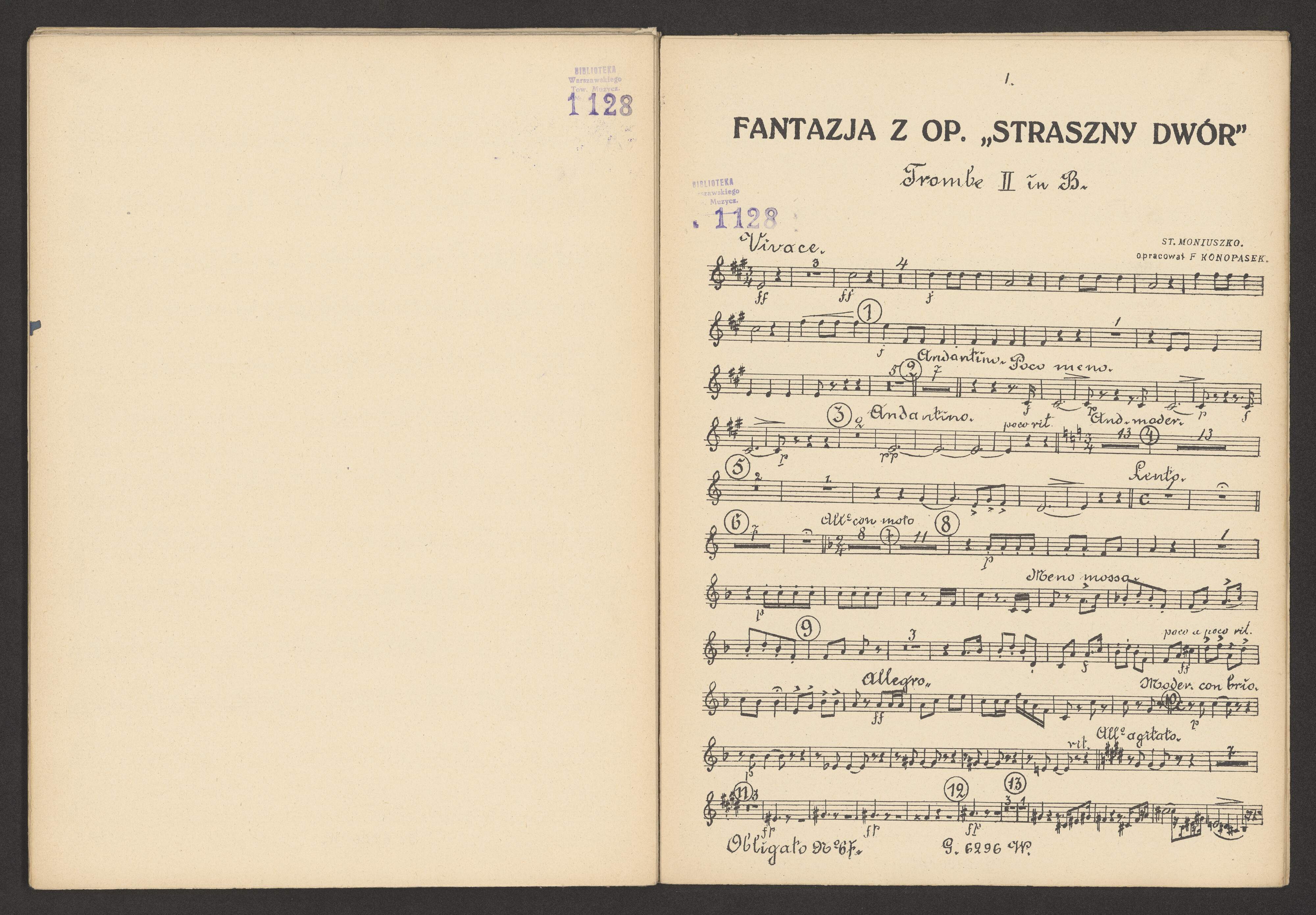 [title page:] STANISŁAW MONIUSZKO | FANTAZJA | z Opery | Straszny Dwór | Opracował | na orkiestrę salonową | FELIKS KONOPASEK | NAKŁAD I WŁASNOŚĆ | GEBETHNERA I WOLFFA | Warszawa-Kraków-Lublin-Łódź-Poznań | Wilno-Zakopane | Paris VIe. 123 Boulevard St. Germain 123. | New-York. The Polish Book Importing Co. Inc. | Zakł. Graf. B. Wierzbicki i S=ka, Warszawa