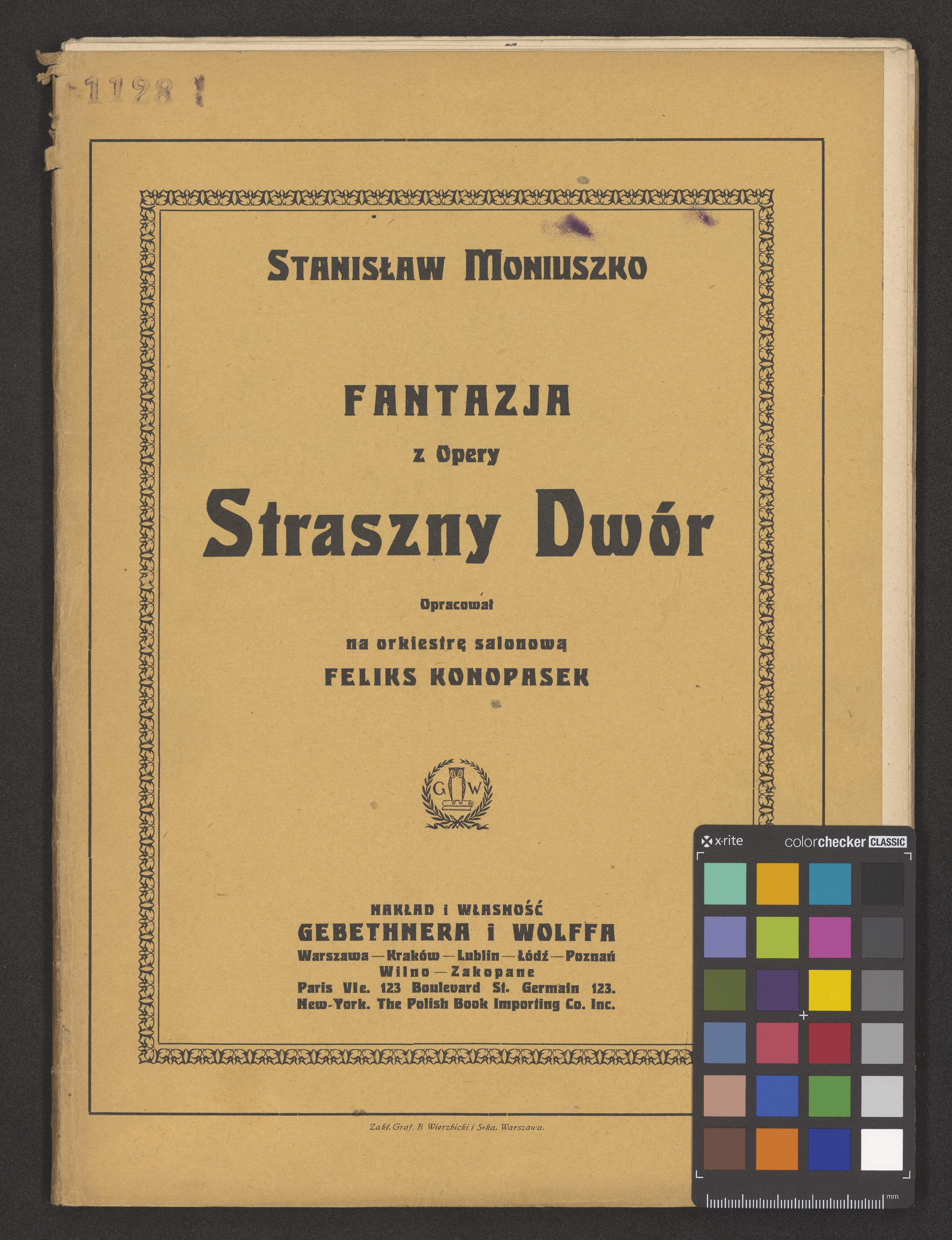 [title page:] STANISŁAW MONIUSZKO | FANTAZJA | z Opery | Straszny Dwór | Opracował | na orkiestrę salonową | FELIKS KONOPASEK | NAKŁAD I WŁASNOŚĆ | GEBETHNERA I WOLFFA | Warszawa-Kraków-Lublin-Łódź-Poznań | Wilno-Zakopane | Paris VIe. 123 Boulevard St. Germain 123. | New-York. The Polish Book Importing Co. Inc. | Zakł. Graf. B. Wierzbicki i S=ka, Warszawa