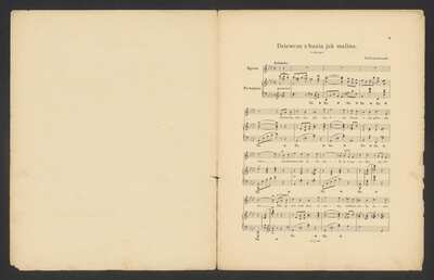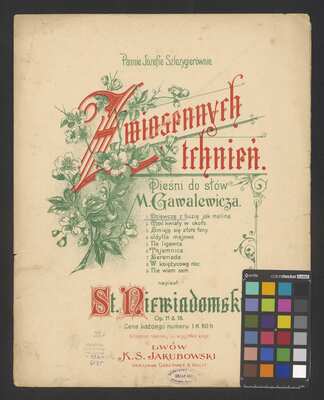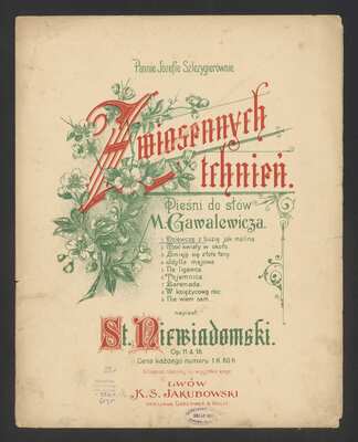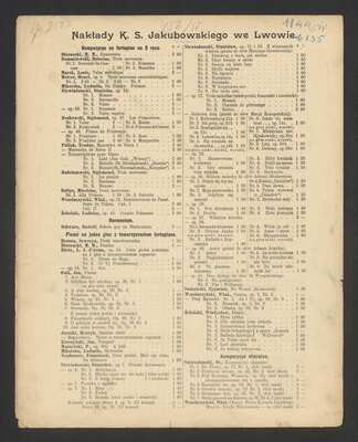TP, [2] blank, 3-5 [musical text], [6] [publisher's advertisment]., [pl-text: Strona tytułowa, [2] pusta, 3-5 [tekst muzyczny], [6] [reklama wydawcy].], Purple stamp on the title page: "BIBLIOTEKA | Warszawskiego | Tow. Muzycz. | Nr"., [pl-text: Fioletowa pieczęć na stronie tytułowej: "BIBLIOTEKA | Warszawskiego | Tow. Muzycz. | Nr"]., Purple stamp on the title page: „GEBETHNER I WOLFF | SKŁAD NUT | KRAKÓW, Rynek 23.”., [pl-text: Fioletowa pieczęć na stronie tytułowej: „GEBETHNER I WOLFF | SKŁAD NUT | KRAKÓW, Rynek 23.”]., KD | 8925 51044649
