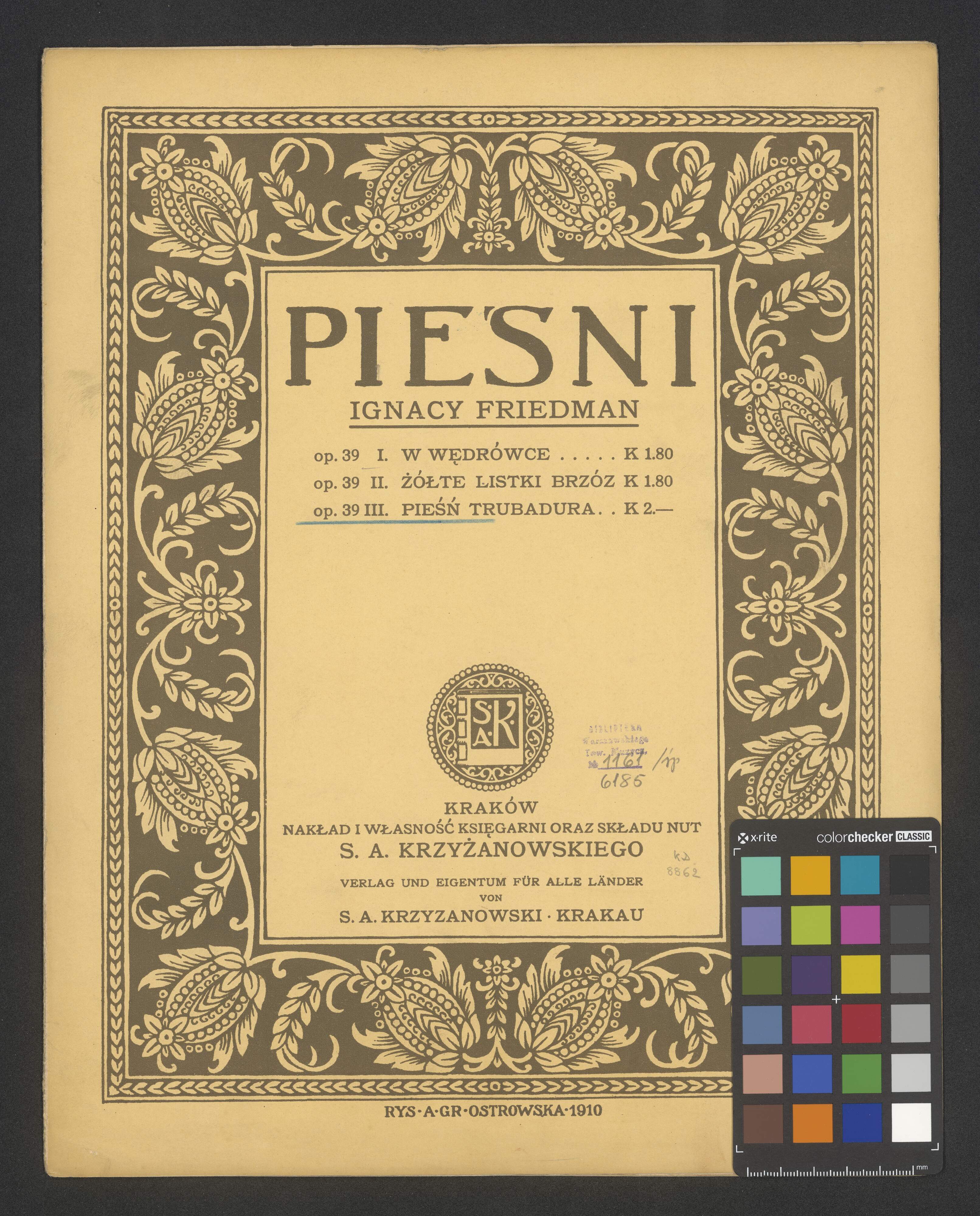 PIEŚNI | IGNACY FRIEDMAN | op. 39 I. W WĘDRÓWCE ..... K 1.80 | op. 39 II. ŻÓŁTE LISTKI BRZÓZ K 1.80 | op. 39 III. PIEŚŃ TRUBADURA .. K 2.- | KRAKÓW | NAKŁAD I WŁASNOŚĆ KSIĘGARNI ORAZ SKŁADU NUT | S. A. KRZYŻANOWSKIEGO | VERLAG UND EIGENTUM FÜR ALLE LÄNDER | VON | S. A. KRZYŻANOWSKI . KRAKAU | RYS . A . GR . OSTROWSKA . 1910