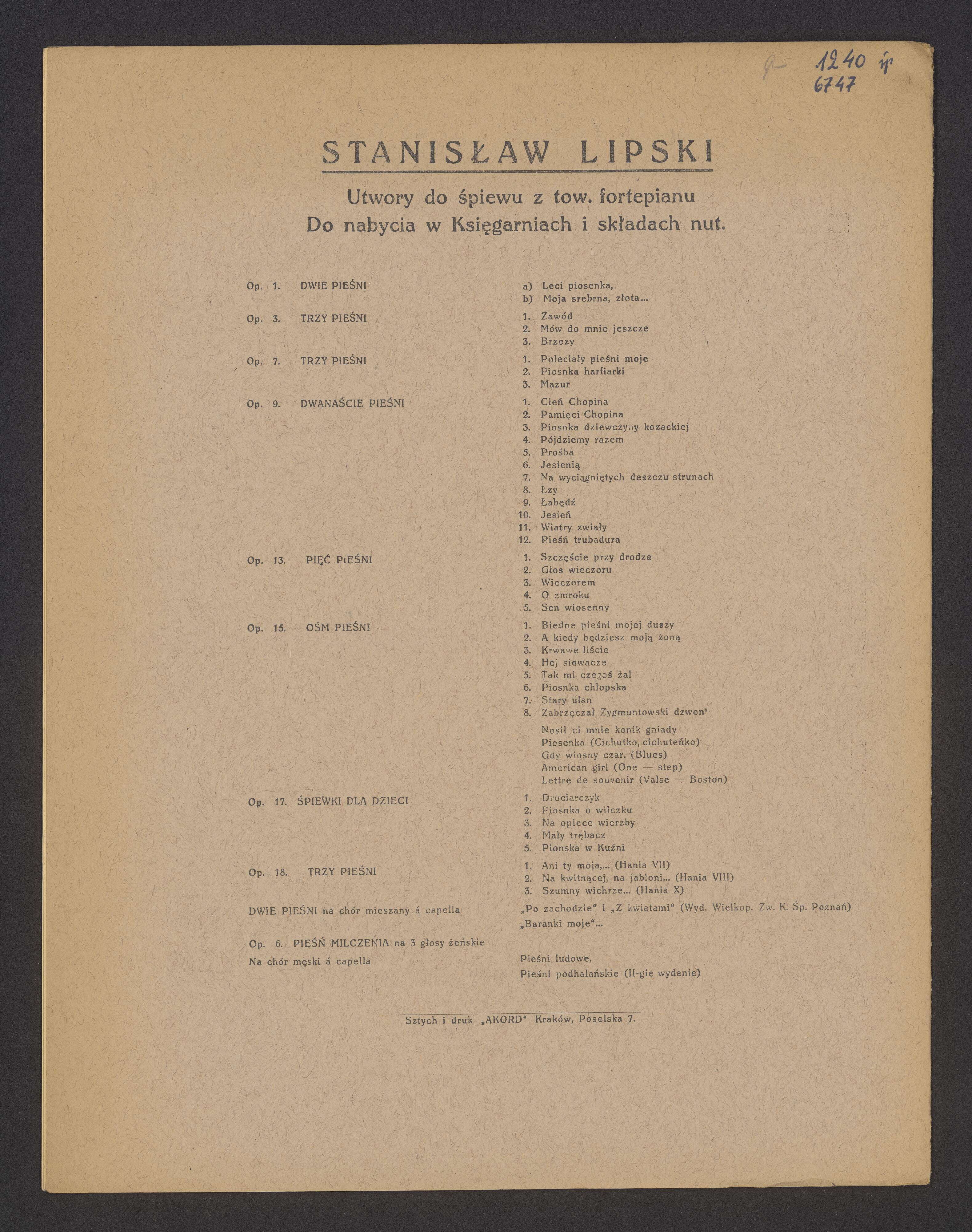 [title page:] STANISŁAW LIPSKI | Op. 18. | TRZY PIEŚNI | do słów | LUCJANA RYDLA | 1) Ani ty moja... [Hania VII] | 2) Na kwitnącej, na jabłoni... [Hania VIII] | 3) Szumny wichrze... (Hania X) | Nakład i własność autora | KRAKÓW 1931. | Skład główny | A. PIWARSKI I SKA. | W KRAKOWIE