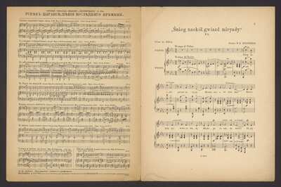 Structure of the print: cover - p. [2]: advertisement (a list of works with incipits) - p. 3-5: "Śnieg naokół" - back cover: advertisement (a list of works with incipits), [pl-text: Na piątej stronie pod nutami znajduje się informacja: "ГРАВИРОВКА ПЕЧАТЬ Г.ШМИДТ. С.П.Б. 4 РОТА 20.".], Purple stamp on the title page: "BIBLIOTEKA | Warszawskiego | Tow. Muzycz. | Nr"., [pl-text: Fioletowa pieczęć na stronie tytułowej: "BIBLIOTEKA | Warszawskiego | Tow. Muzycz. | Nr"]., Red stamp on the title page: "KSIĘGARNIA I SKŁAD NUT | M. BORKOWSKI | WARSZAWA | 97, MARSZAŁKOWSKA 97,"., [pl-text: Czerwona pieczęć na stronie tytułowej: "KSIĘGARNIA I SKŁAD NUT | M. BORKOWSKI | WARSZAWA | 97, MARSZAŁKOWSKA 97,"]., [pl-text: Na stronie tytułowej fragment tekstu: "N|o 5." podkreślony jest niebieską kredką.], [pl-text: Na stronie [2] znajduje się czarna pieczęć: "BIBLIOTEKA | Warszawskiego | Tow. Muzycz. | Nr _" oraz dopisek ołówkiem: "A-32.332/80".], KD | 9658 51044815