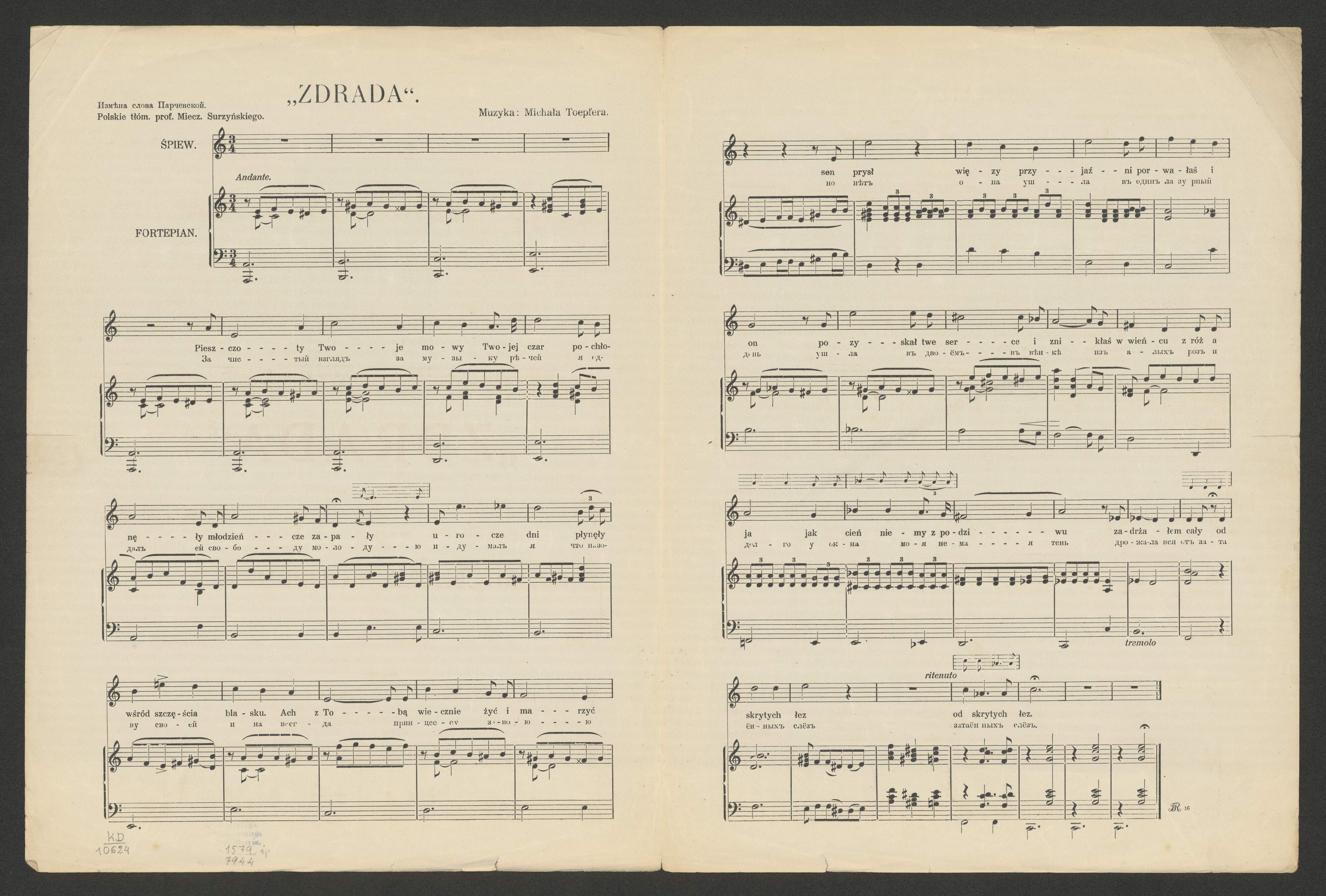 [pl-text:] Zeszyt poświęcony Janinie Klarze Pfauowej. | "ZDRADA" | Śpiew solo z tow. fortepianu | przed | MICHAŁA TOEPFERRA. | Słowa polskie prof. Miecz. Surzyńskiego | Słowa rosyjskie Parczewskiej. | NAKŁADEM LWOWSKIEGO TOW. WYDAWNICZEGO