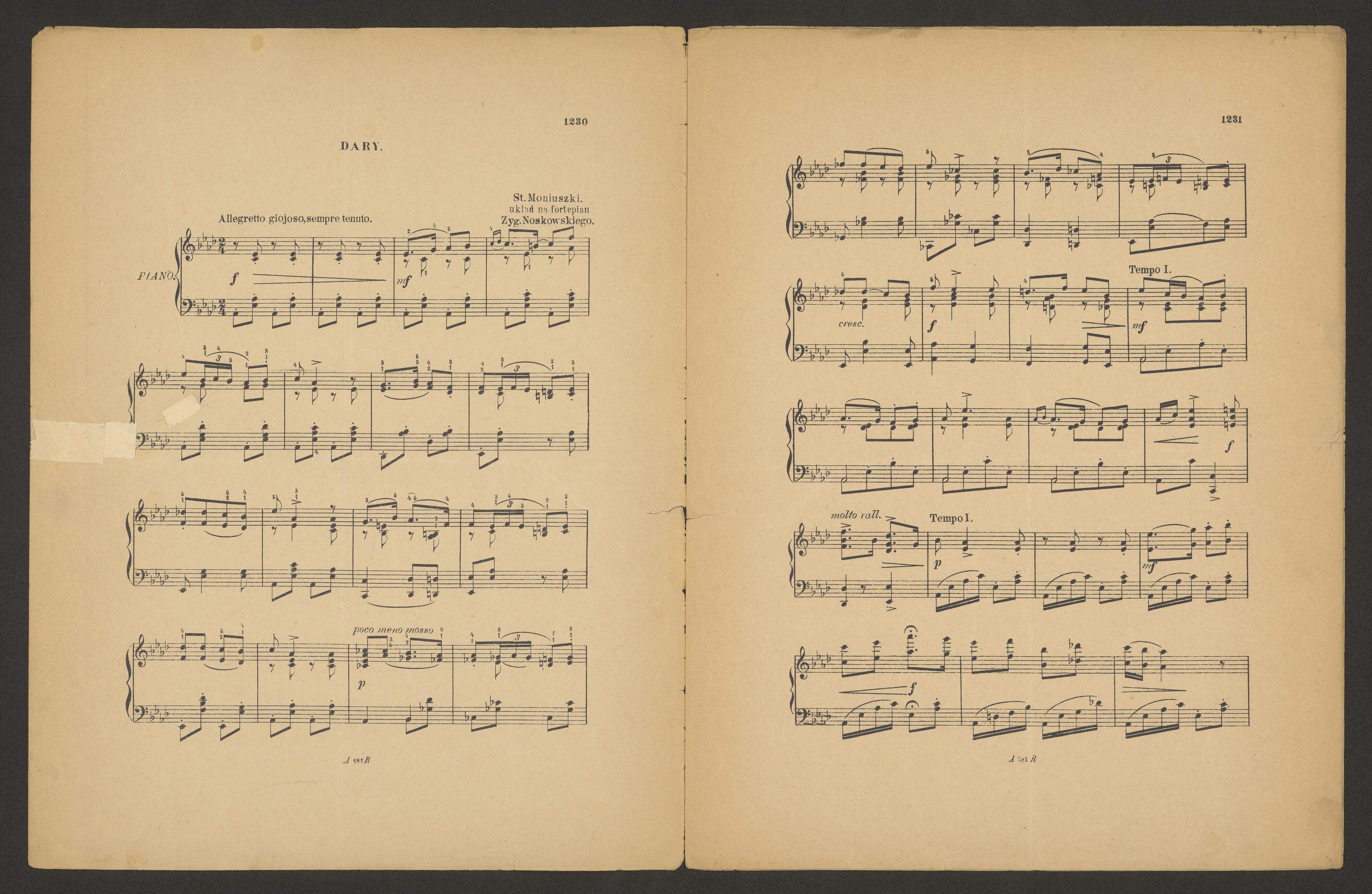 [title page:] STANISŁAW MONIUSZKO. | Dary. | UKŁAD Zyg. Noskowskiego | II. Pożegnanie. | ECHO N|o 527. | SŁOWA PRZEŁOŻONE Z DELAVIGNE'A. | WARSZAWA | Nakładem Redakcyi Echa muz. teatr. i art. | ALEKSANDER RAJCHMAN | Senatorska 2F | W lit. i sztych. nut. S. Orgelbrand