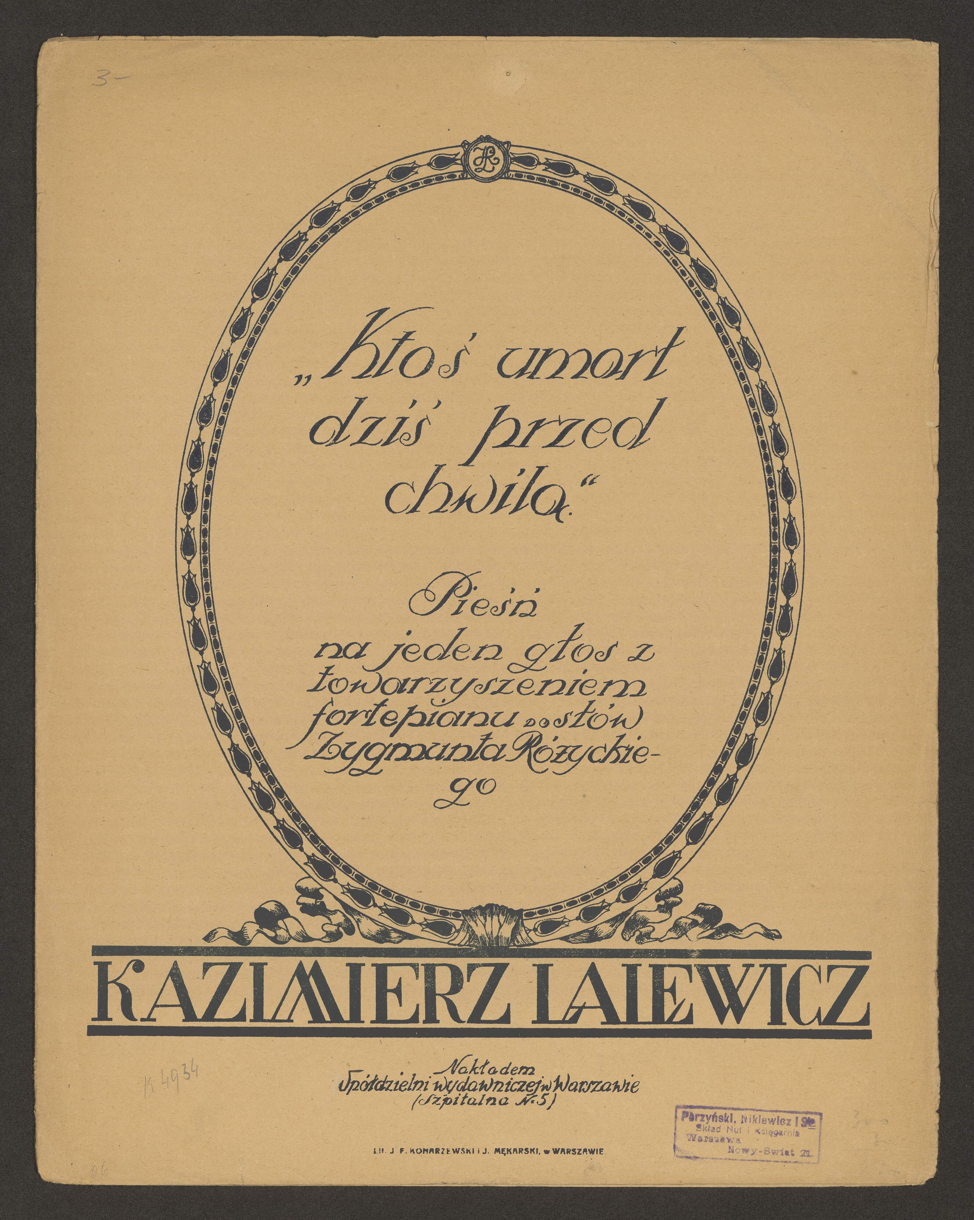 [page title:] "Ktoś umarł | dziś przed | chwilą" | Pieśń | na jeden głos z | towarzyszeniem | fortepianu do słów | Zygmunta Różyckie go | KAZIMIERZ LALEWICZ | Nakładem | Spółdzielni Wydawniczej w Warszawie | (Szpitalna Nr 5) | Lit. J.F. KONARZEWSKI I J. MĘKARSKI w WARSZAWIE