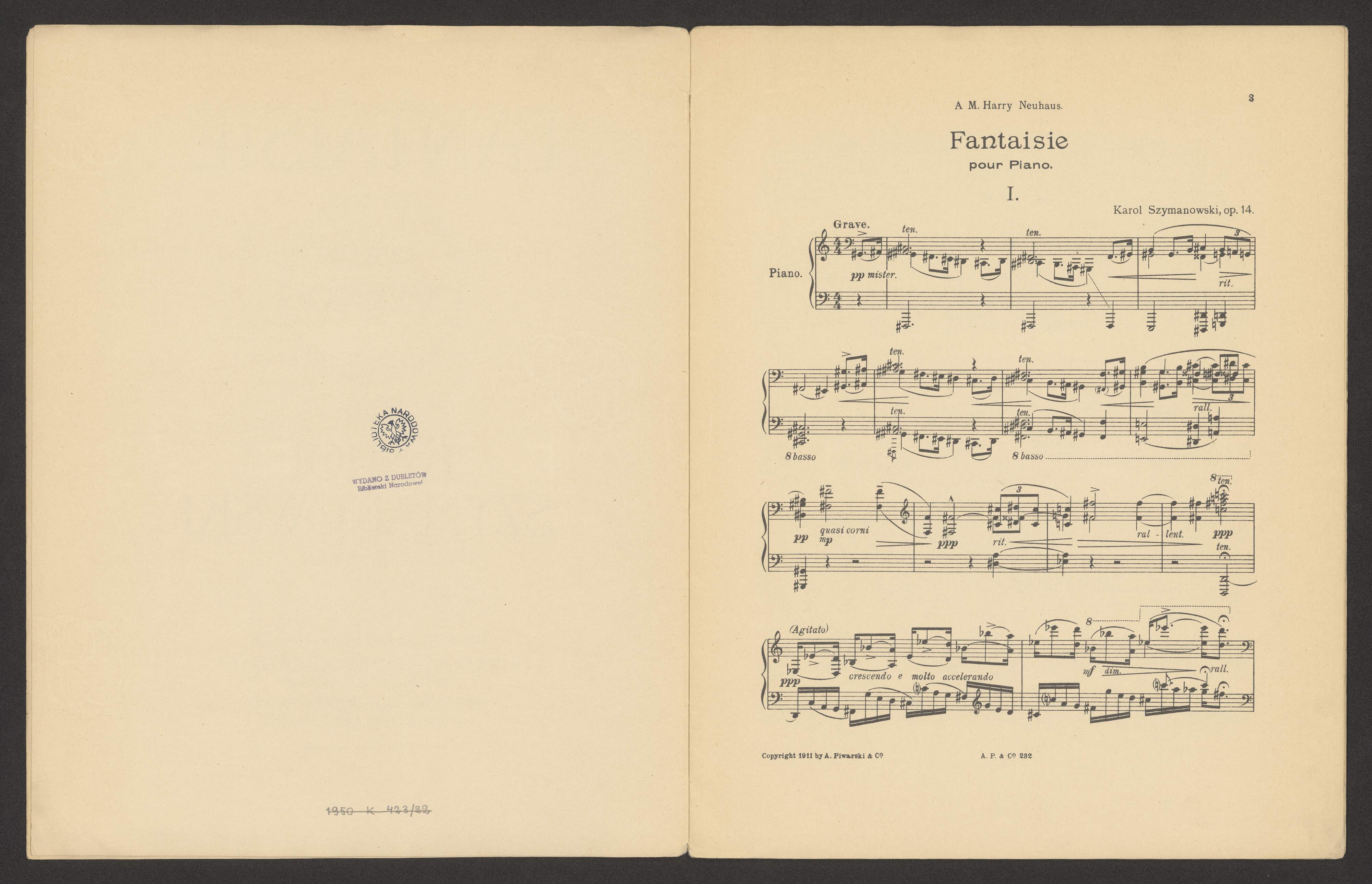 [2nd title page:] FANTAISIE | POUR | PIANO | PAR | KAROL | SZYMANOWSKI | OP. 14. | PROPRIÉTÉ DES ÉDITEURS POUR TOUS PAYS. | CRACOVIE, A. PIWARSKI & CO | EDITEURS DE MUSIQUE. | VARSOVIE, GEBETHNER & WOLFF. | COPYRIGHT 1911 BY A. PIWARSKI & CO. | INST. LITH DE C. G. RÖDER G. M. B. H., LEIPZIG