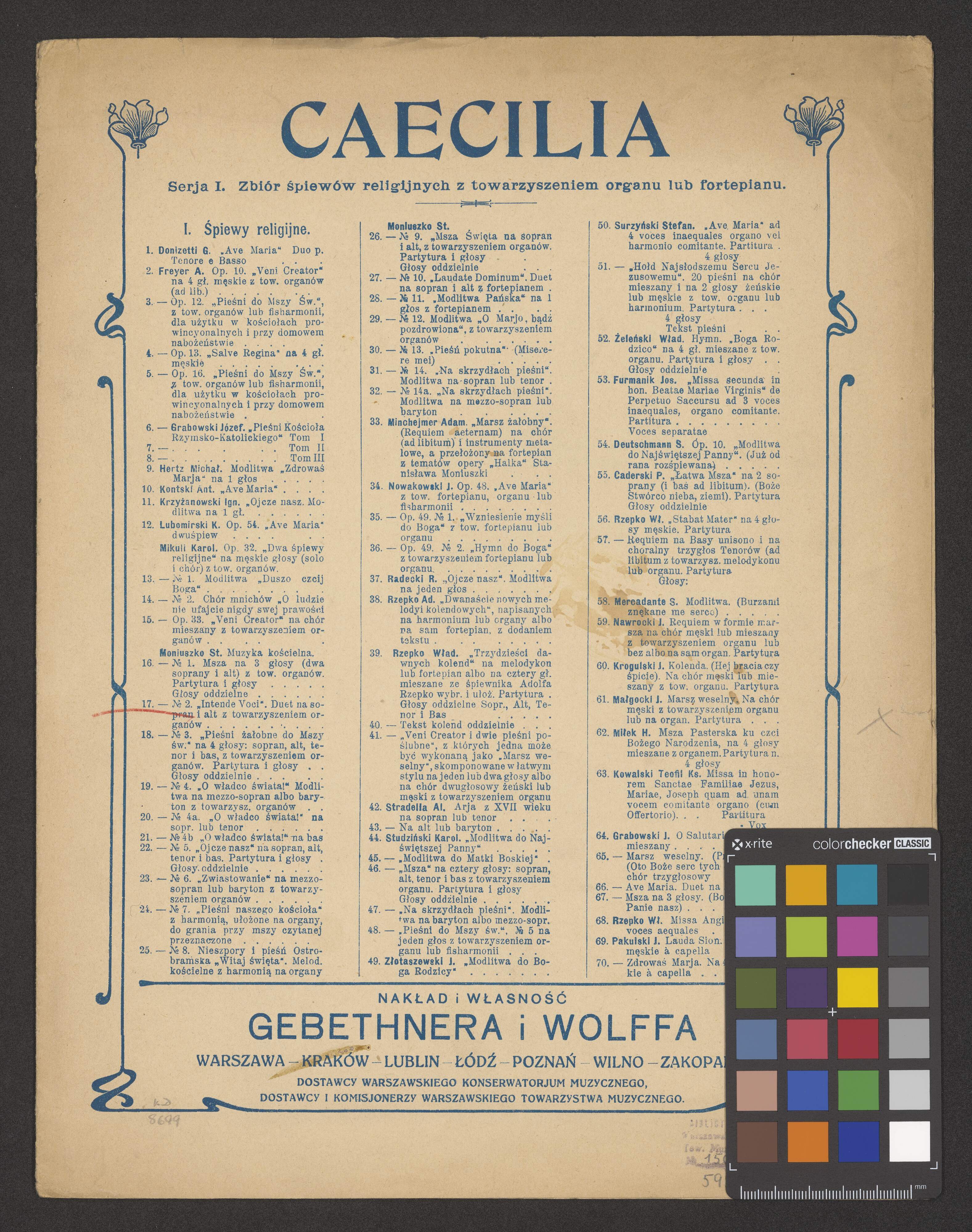 [title page:] CAECILIA | Serja I. Zbiór śpiewów religijnych z towarzyszeniem organu lub fortepianu. | [a list of works by different composers published within the series, organised in three columns; among them: "17. - N|o 2. „Intende Voci”. Duet na sopran i alt z towarzyszeniem organów"] | NAKŁAD I WŁASNOŚĆ | GEBETHNERA i WOLFFA | WARSZAWA - KRAKÓW - LUBLIN - ŁÓDŹ - POZNAŃ - WILNO - ZAKOPANE. | DOSTAWCY WARSZAWSKIEGO KONSERWATORJUM MUZYCZNEGO, | DOSTAWCY I KOMISJONERZY WARSZAWSKIEGO TOWARZYSTWA MUZYCZNEGO