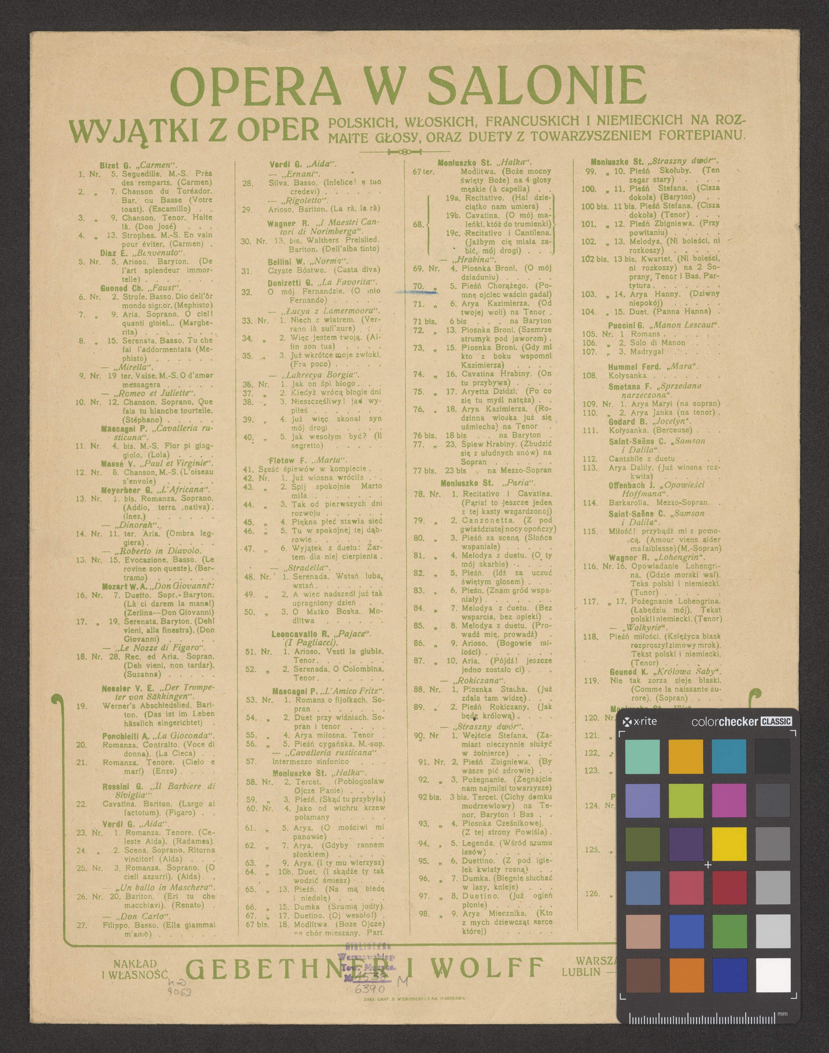 [title page:] OPERA W SALONIE | WYJĄTKI Z OPER POLSKICH, WŁOSKICH, FRANCUSKICH I NIEMIECKICH NA ROZ- | MAITE GŁOSY, ORAZ DUETY Z TOWARZYSZENIEM FORTEPIANU. | [list of compositions] | NAKŁAD | I WŁASNOŚĆ [space] GEBETHNER I WOLFF [space] | WARSZAWA - KRAKÓW | LUBLIN - ŁÓDŹ - POZNAŃ. | ZAKŁ. GRAF. B. WIERZBICKI I S-KA. WARSZAWA