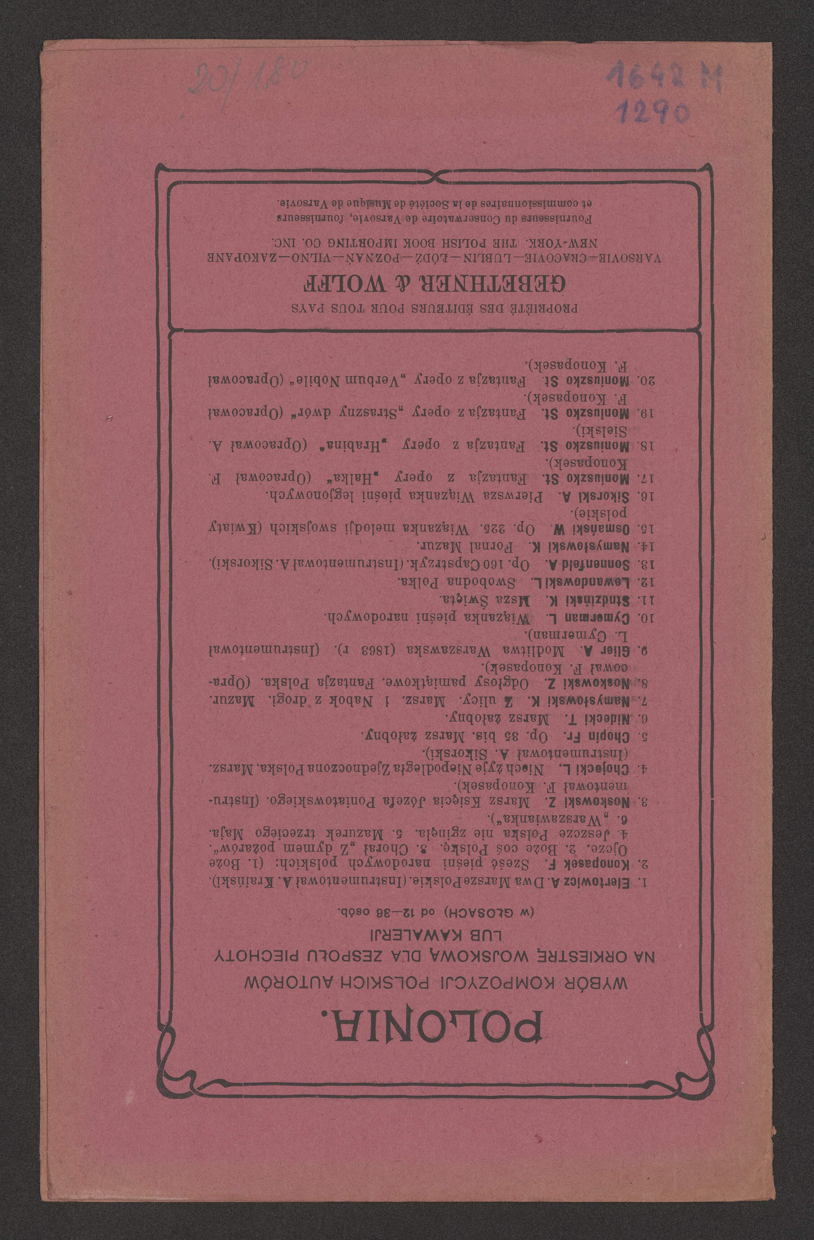 Polonia N|o 49. St. Moniuszko. "DARY". | POLONIA. | WYBÓR KOMPOZYCJI POLSKICH AUTORÓW | NA ORKIESTRĘ WOJSKOWĄ DLA ZESPOŁU PIECHOTY | LUB KAWALERJI | (W GŁOSACH) od 12-36 osób. | [list of compositions] | PROPRIÉTÉ DES ÉDITEURS PORUS TOUS PAYS | GEBETHNER & WOLFF | VARSOVIE - CRACOVIE - LUBLIN - ŁÓDŹ - POZNAŃ - VILNO - ZAKOPANE | NEW YORK. THE POLISH BOOK IMPORTING CO. INC. | Fournisseurs du Conservatoire de Varsovie, fournisserus | et commissionnaires de la Société de Musique de Varsovie