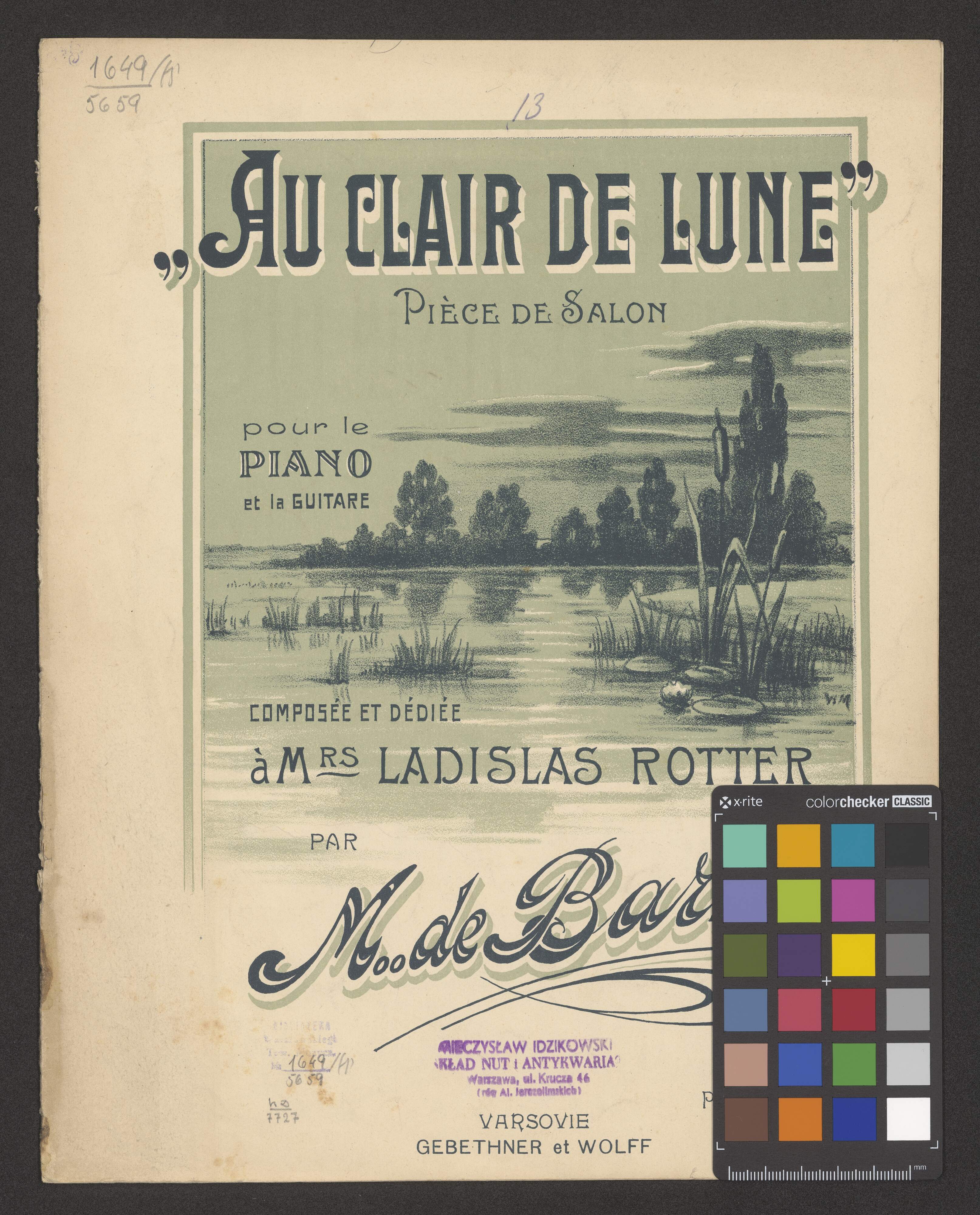 [title page:] „AU CLAIR DE LUNE” | PIÈCE DE SALON | pour le | PIANO | et la GUITARE | COMPOSÉE ET DÉDIÉE | à M|R|S LADISLAS ROTTER | PAR | M.. [!] de Bark | Op. 2. | Prix 40 cop. | VARSOVIE | GEBETHNER et WOLFF