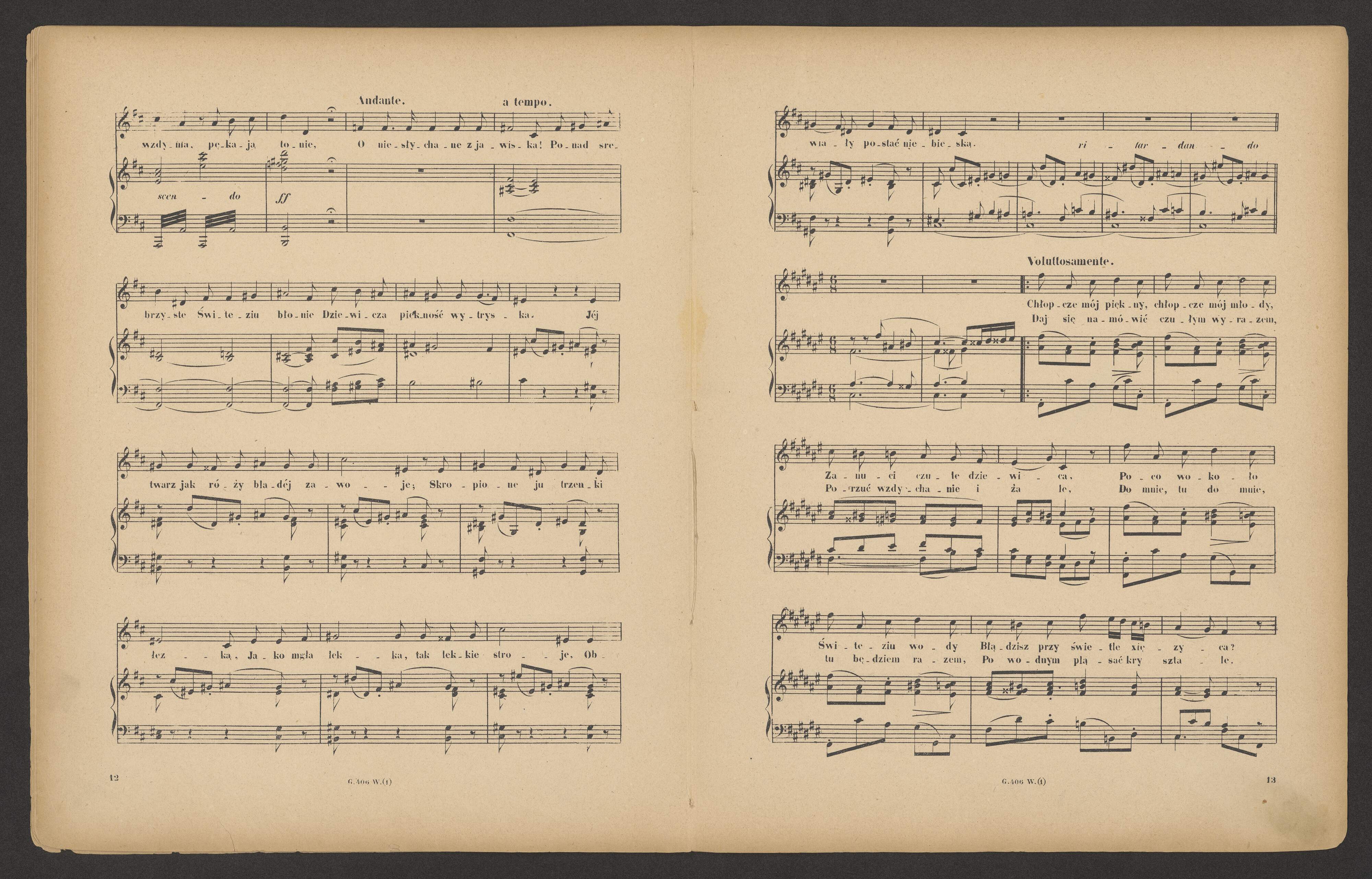 [title page:] PIERWSZY | ŚPIEWNIK DOMOWY | Stanisława Moniuszki. | Wydanie trzecie. | [a list of songs published within the series; among them: „N|o 1. Świtezianka, Ballada ... Złp. 6.”] | (Cena: Kompletuegs [!] spiewnika [!] Złp. 30). | WARSZAWA NAKŁAD I WŁASNOŚĆ GEBETHNERA I WOLFFA. | G. 406-421. W