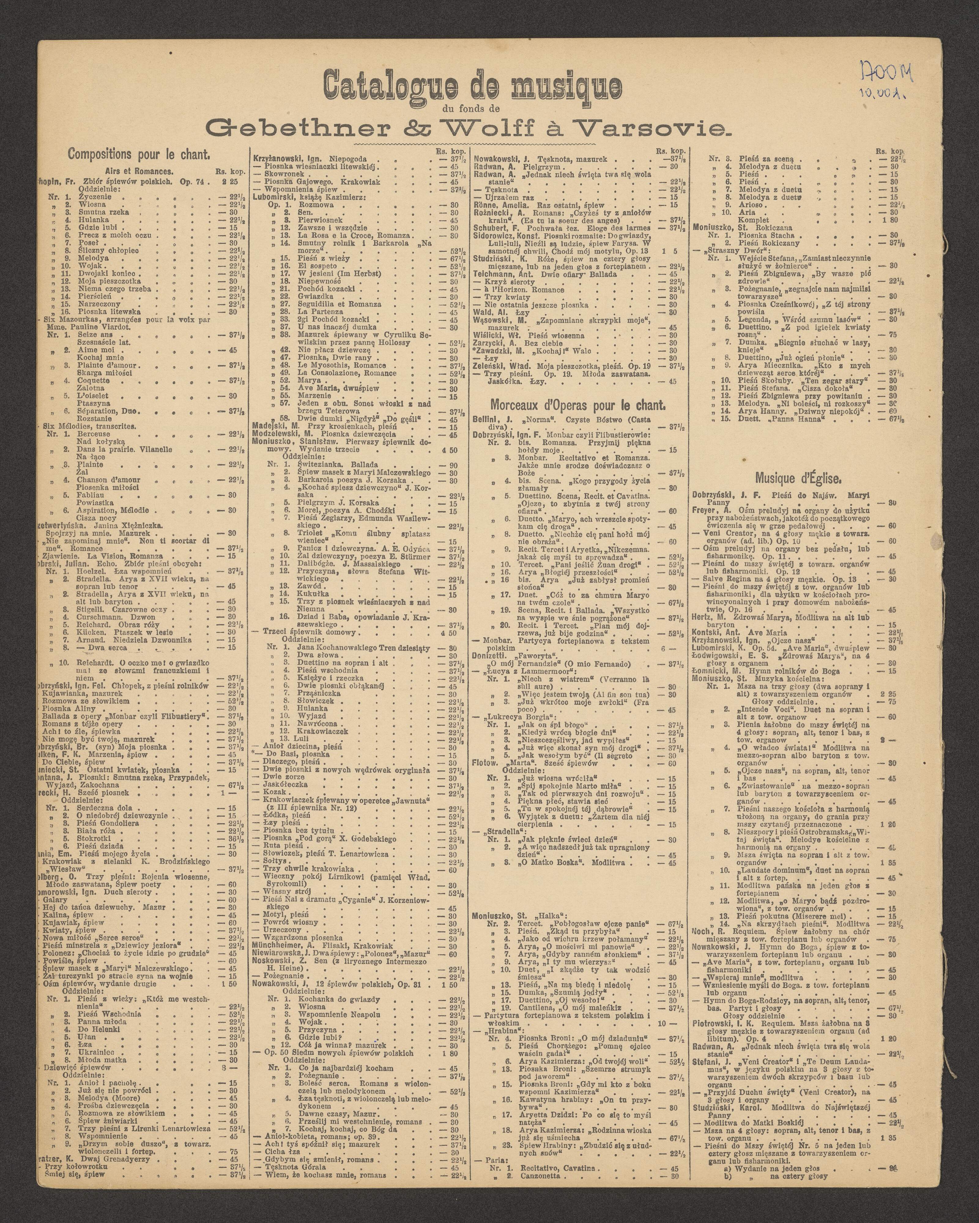 [title page:] HALKA | Opera w czterech Aktach [space] Słowa Włodzimierza Wolskiego | MUZYKA | STANISŁAWA MONIUSZKI. | [incipits of excerpts from "Halka" by S. Moniuszko, published within the series, organised in two columns] | WARSZAWA, NAKŁAD I WŁASNOŚĆ GEBETHNERA I WOLFFA | Ulica Krakowskie Przedmieście Nº. 415