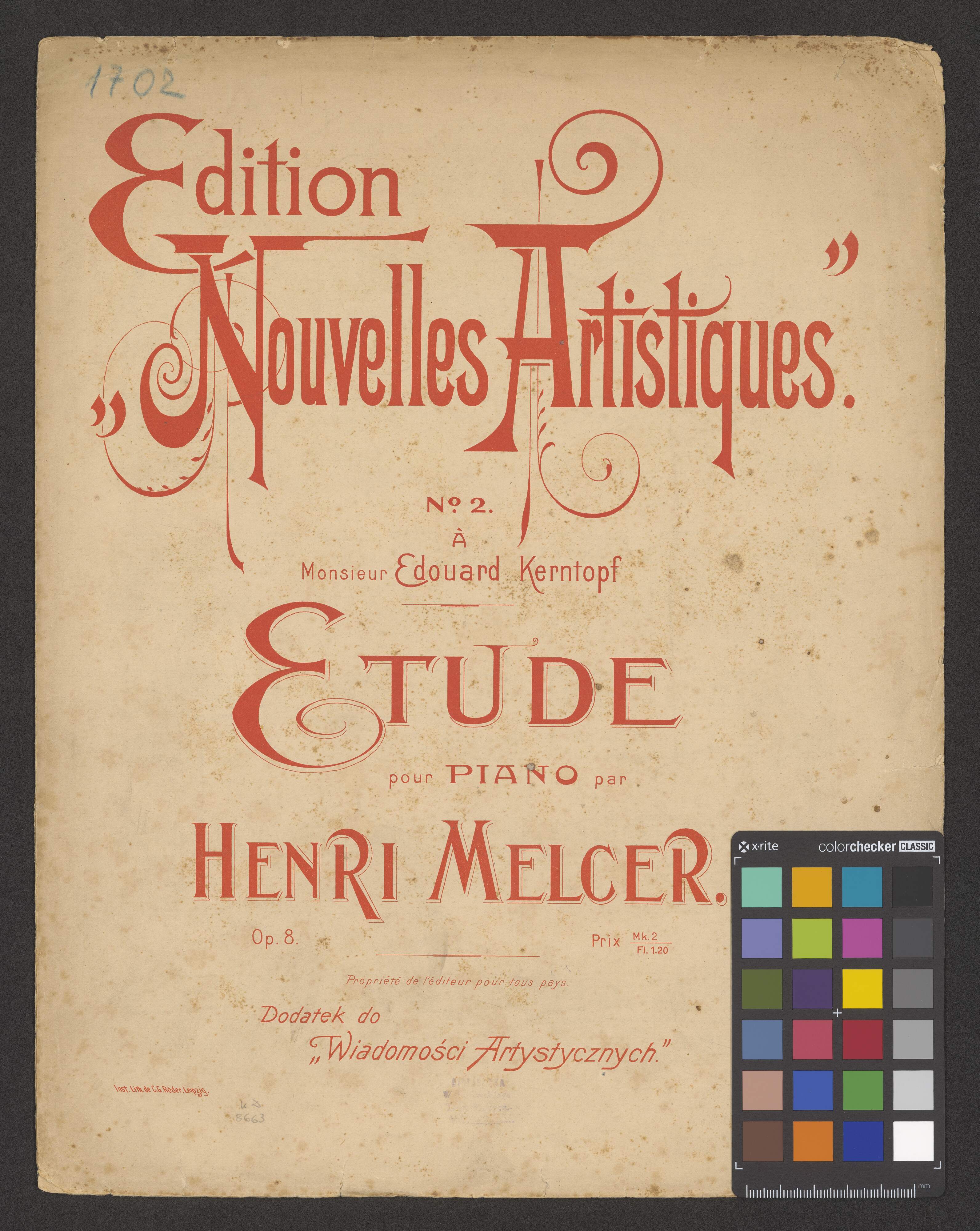 [title page:] Edition | „Nouvelles Artistiques.” | N|o. 2. | À | Monsieur Edouard Kerntopf | ETUDE | pour | PIANO | par | HENRI MELCER. | Op. 8. [space] Prix Mk. 2 | Fl. 1.20 | Propriété de l'éditeur pour tous pays. | Dodatek do | „Wiadomości Artystycznych.” | Inst. Lith. de C. G. Röder, Leipzig