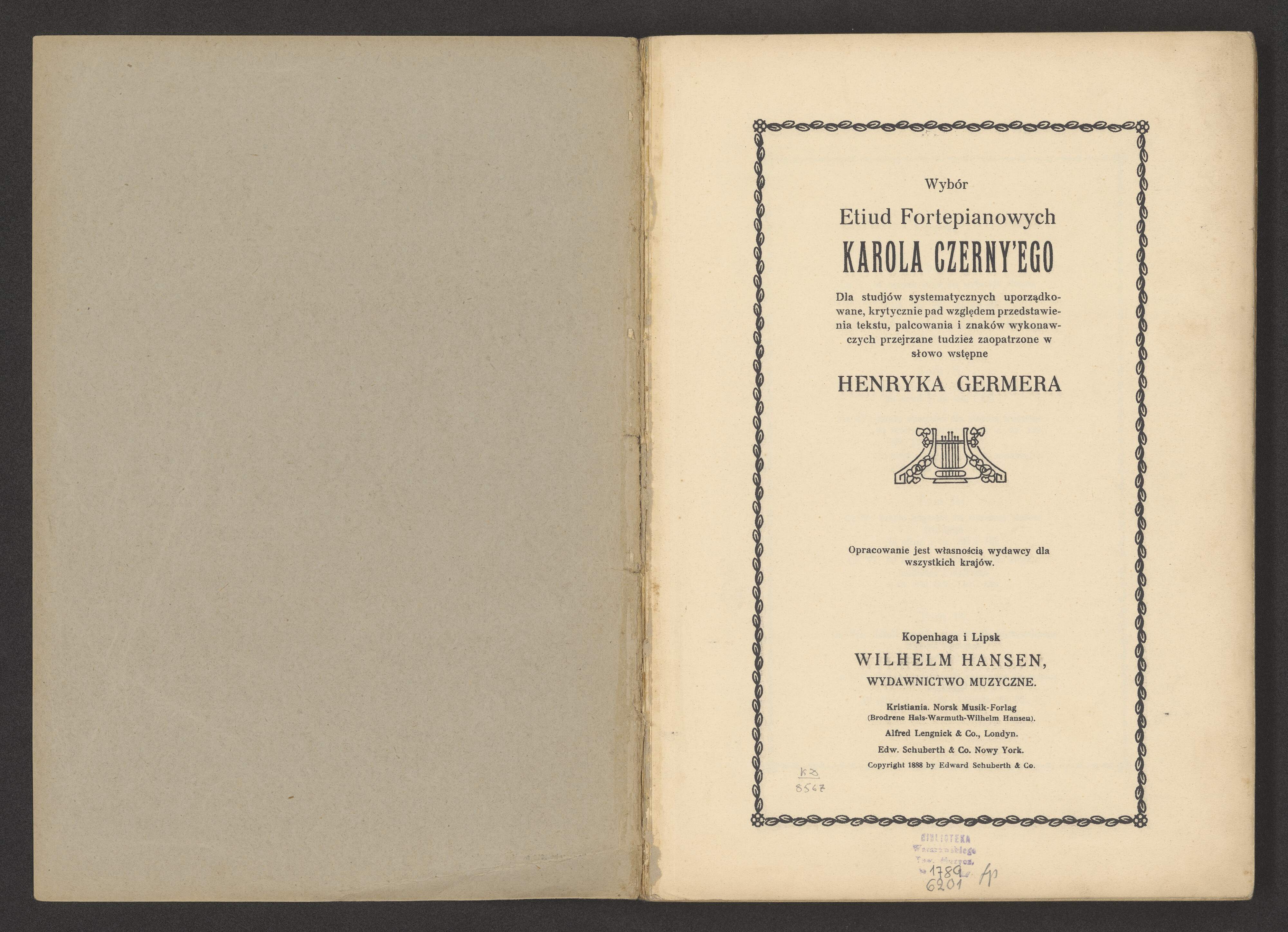 Wybór | Etiud Fortepianowych | KAROLA CZERNY'EGO. | Dla studjów systematycznych uporządko- | wane, krytycznie pod względem przedstawie- | nia tekstu, palcowania i znaków wykonaw- | czych przejrzane tudzież zaopatrzone w | słowo wstępne | HENRYKA GERMERA | Opracowanie jest własnością wydawcy dla | wszystkich krajów. | Kopenhaga i Lipsk | WILHELM HANSEN, WYDAWNICTWO MUZYCZNE. | Kristiania. Norsk Musik-Forlag. | (Brodrene Hals - Warmuth - Wilhelm - Hansen). | Alfred Lengnick Co., Londyn. | Edw. Schubert & Co. Nowy York. | Copyright 1888 by Edward Schuberth & Co